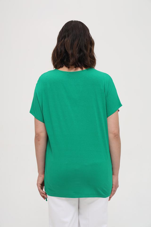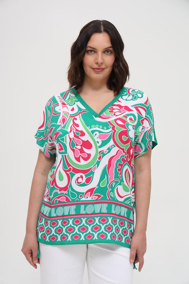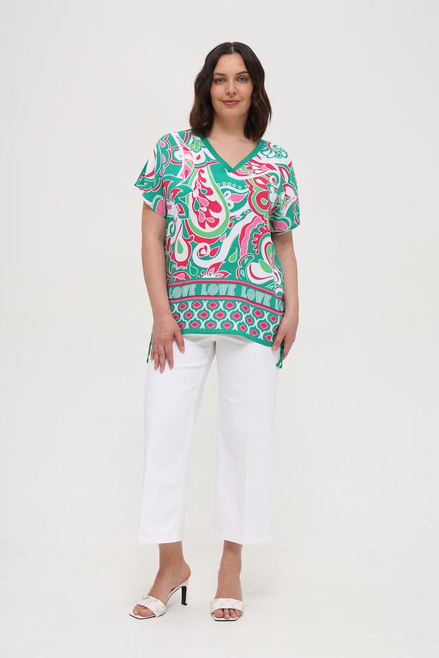 Блуза Via Appia зеленого цвета с ярким цветочным принтом и надписью "LOVE". Модель свободного кроя с V-образным вырезом и короткими рукавами, выполнена из мягкой вискозы с добавлением эластана. Состав: вискоза 94%, эластан 6%