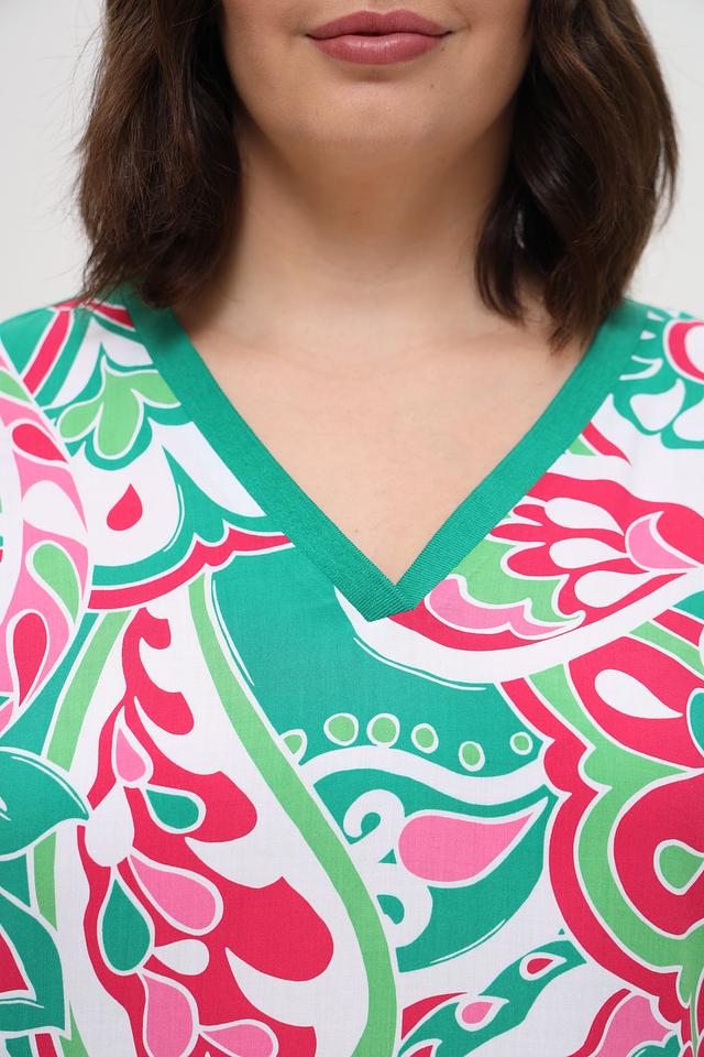 Блуза имеет свободный крой, который обеспечивает комфорт в носке, а V-образный вырез подчеркивает женственность. Короткие рукава делают ее идеальным выбором для теплой погоды.