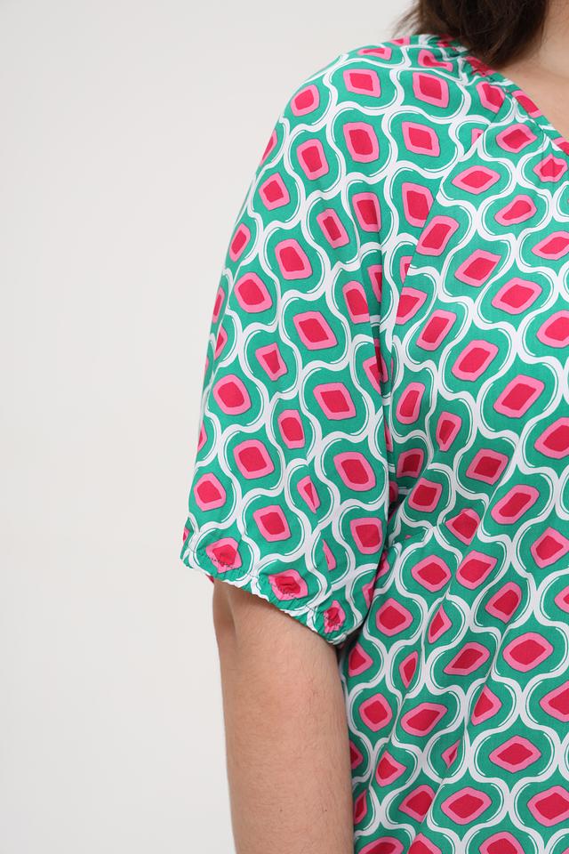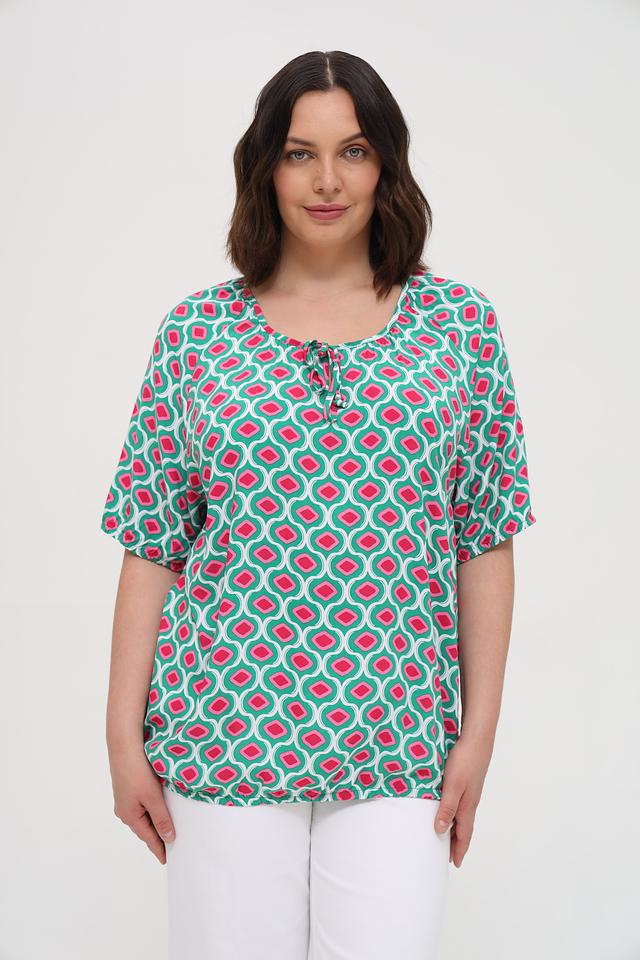 Особенностью данной модели является яркий геометрический принт, сочетающий в себе оттенки зеленого, розового и белого. Круглый вырез горловины дополнен небольшим сборкой и завязками, что придает блузе женственности и изящества. Короткие рукава делают ее идеальной для теплой погоды.