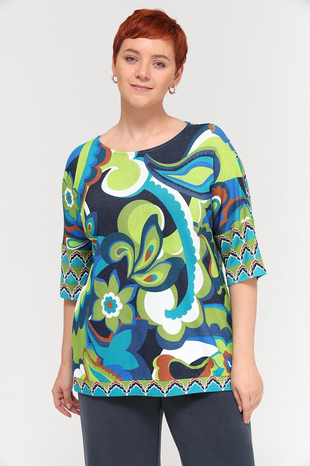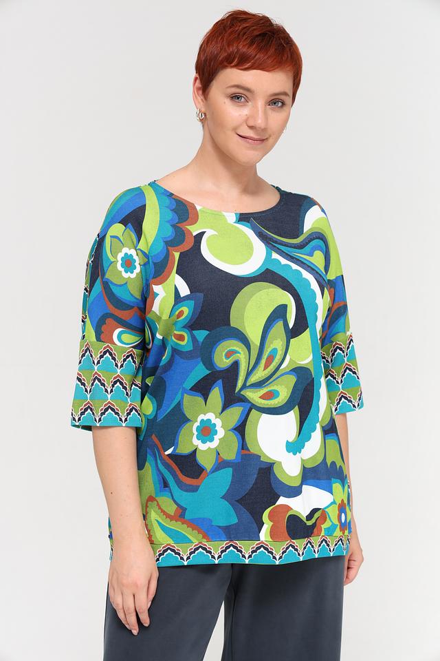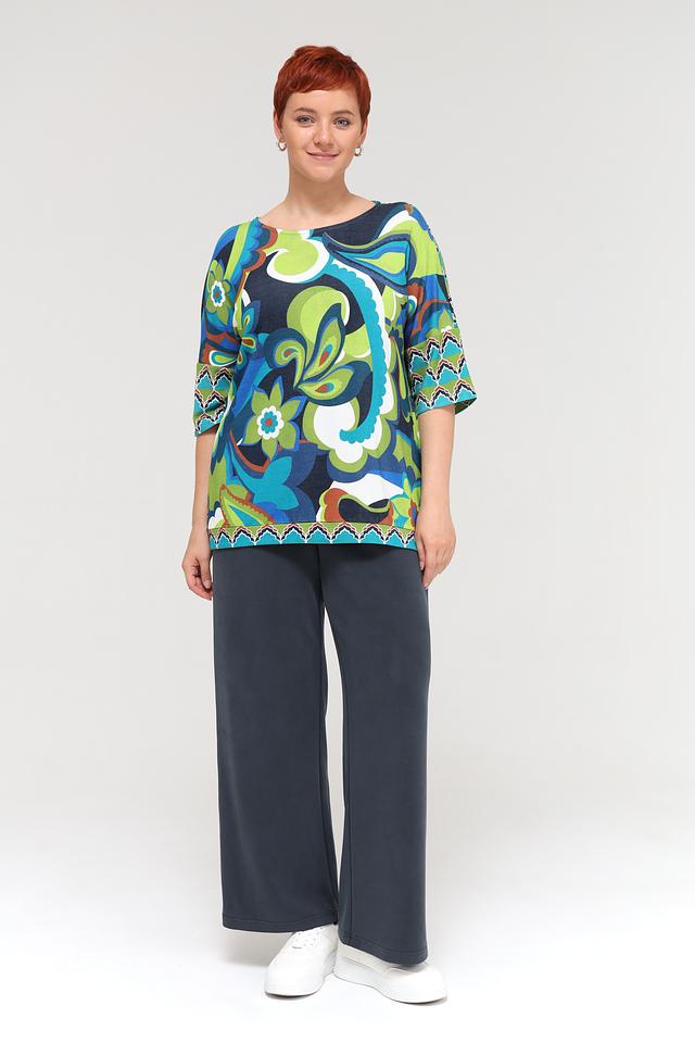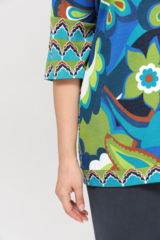 Пуловер имеет свободный крой, короткие рукава и округлый вырез горловины. Главная особенность – эффектный принт с крупными цветами и геометрическими элементами в сине-зеленой гамме. Задняя часть пуловера оформлена повторяющимся геометрическим узором.