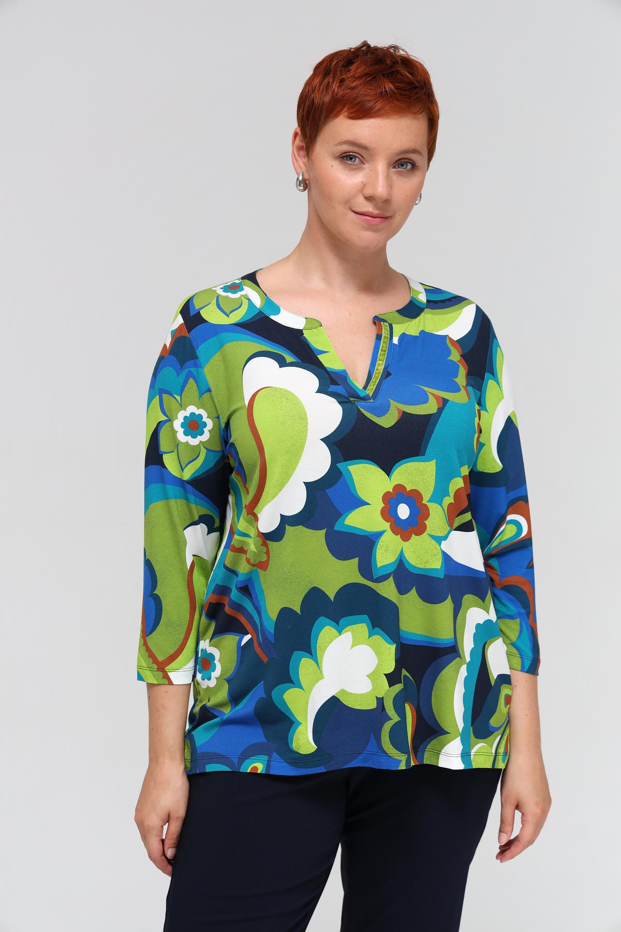 - Яркий дизайн: Насыщенный многоцветный принт с абстрактными цветочными мотивами придает блузе неповторимый и запоминающийся вид, легко сочетаясь как с однотонными брюками, так и с джинсами.