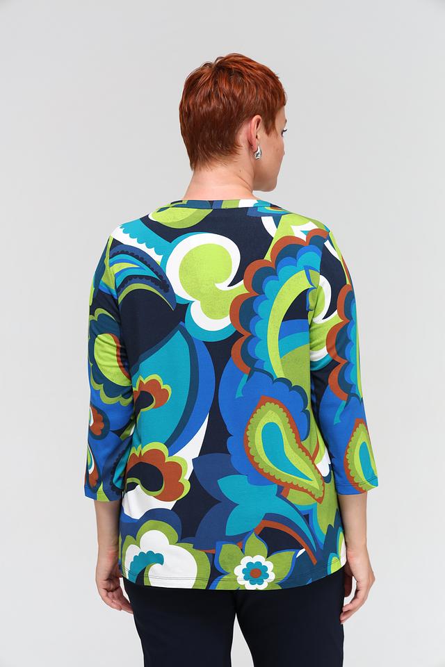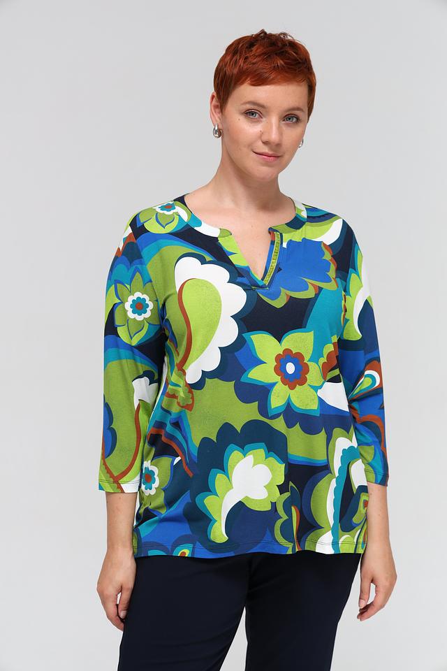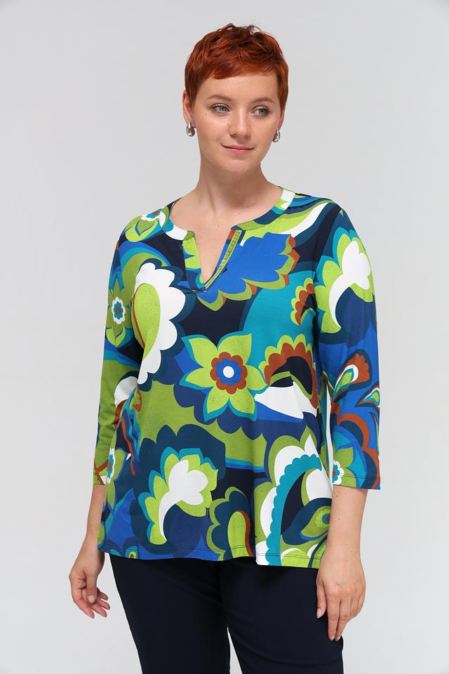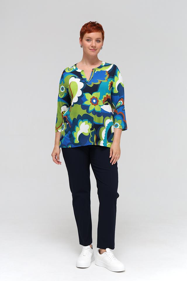 Блуза имеет свободный крой, короткий рукав 3/4 и V-образный вырез горловины. Особенность модели – эффектный цветочный принт, сочетающий в себе оттенки синего, зеленого и белого. Такой рисунок добавит образу свежести и легкости.