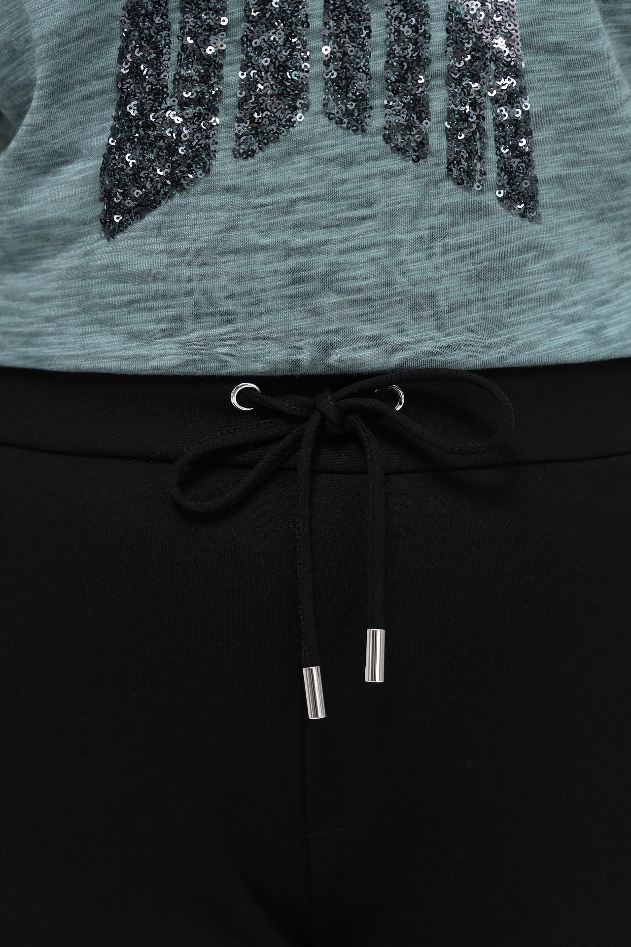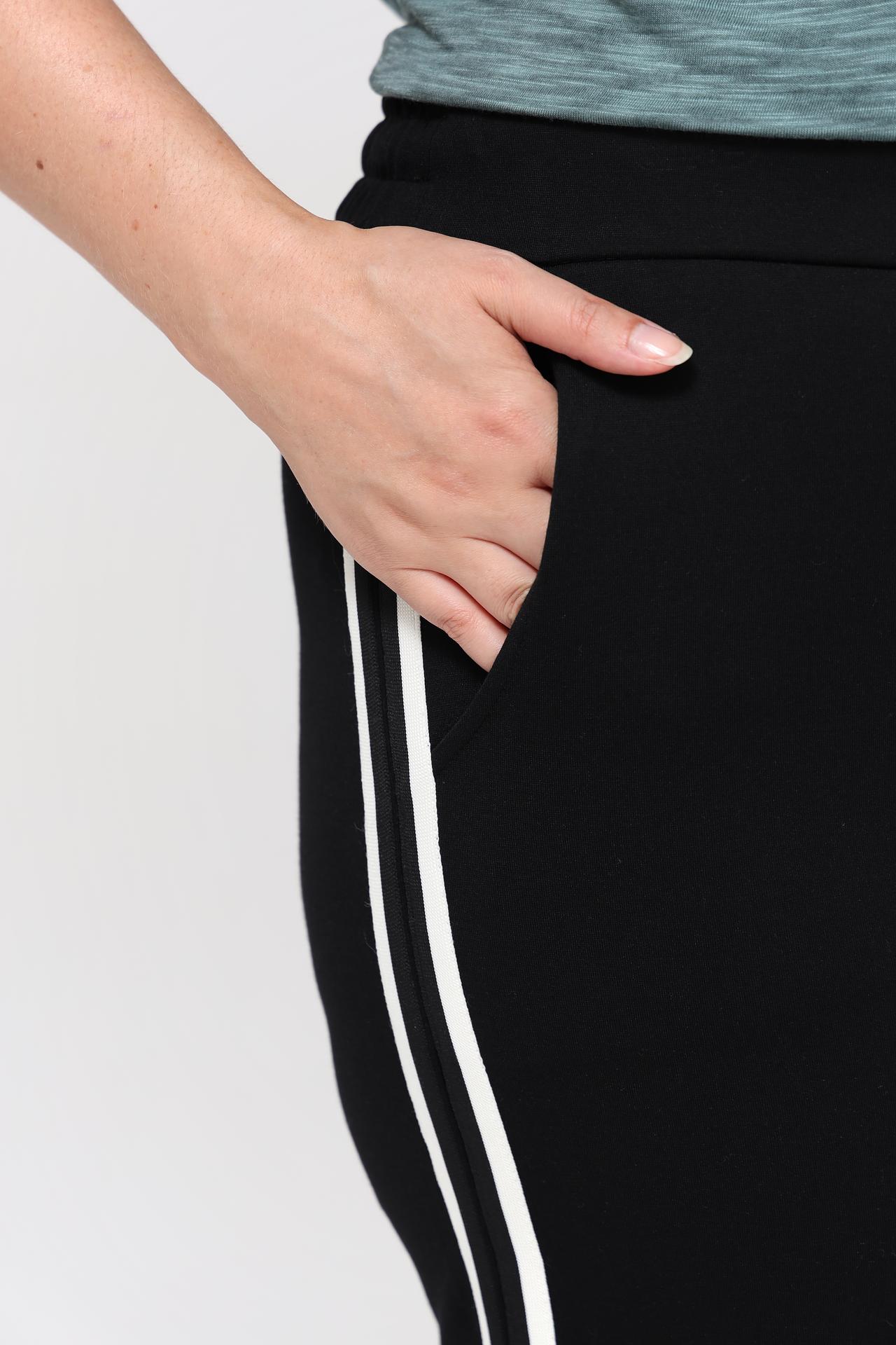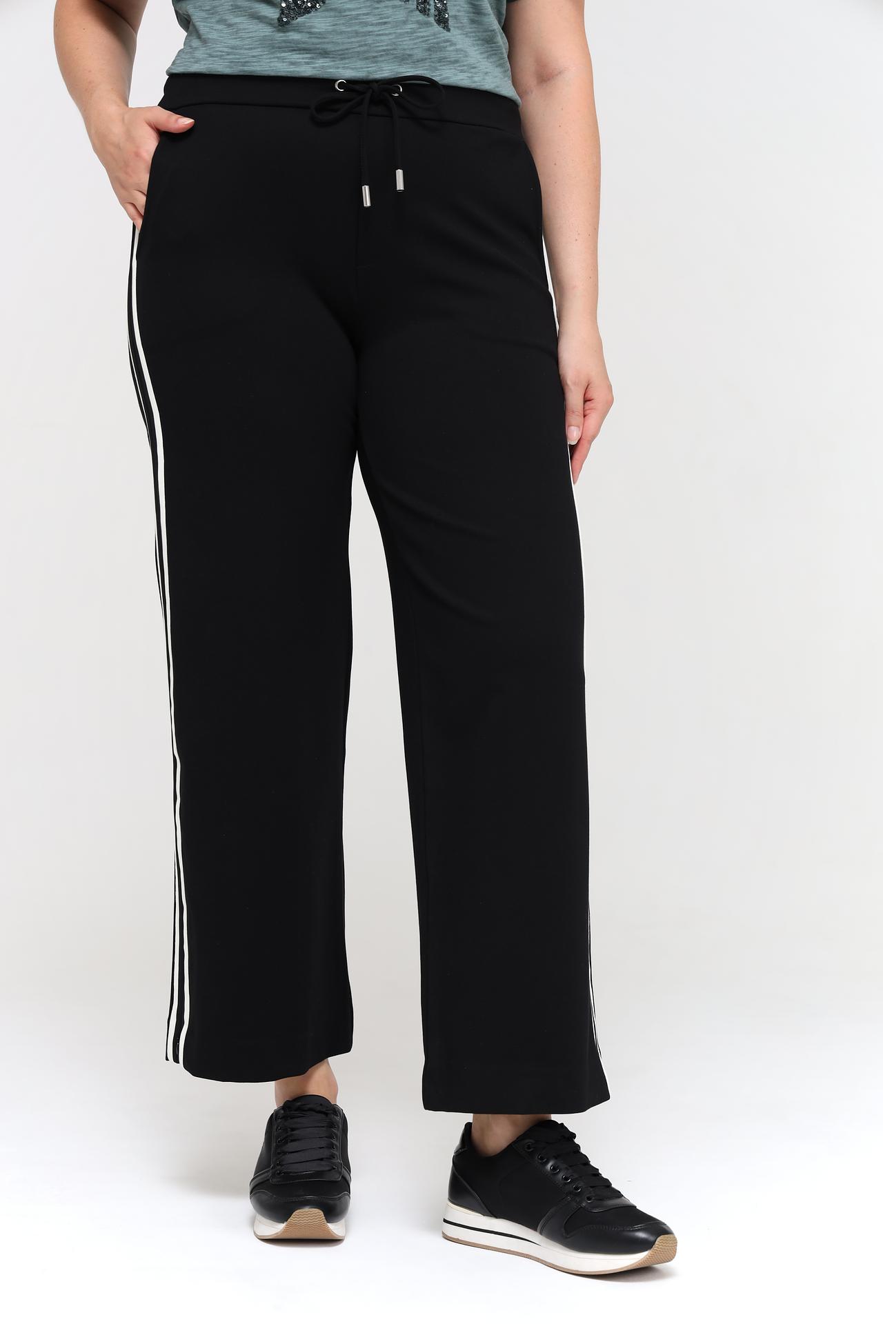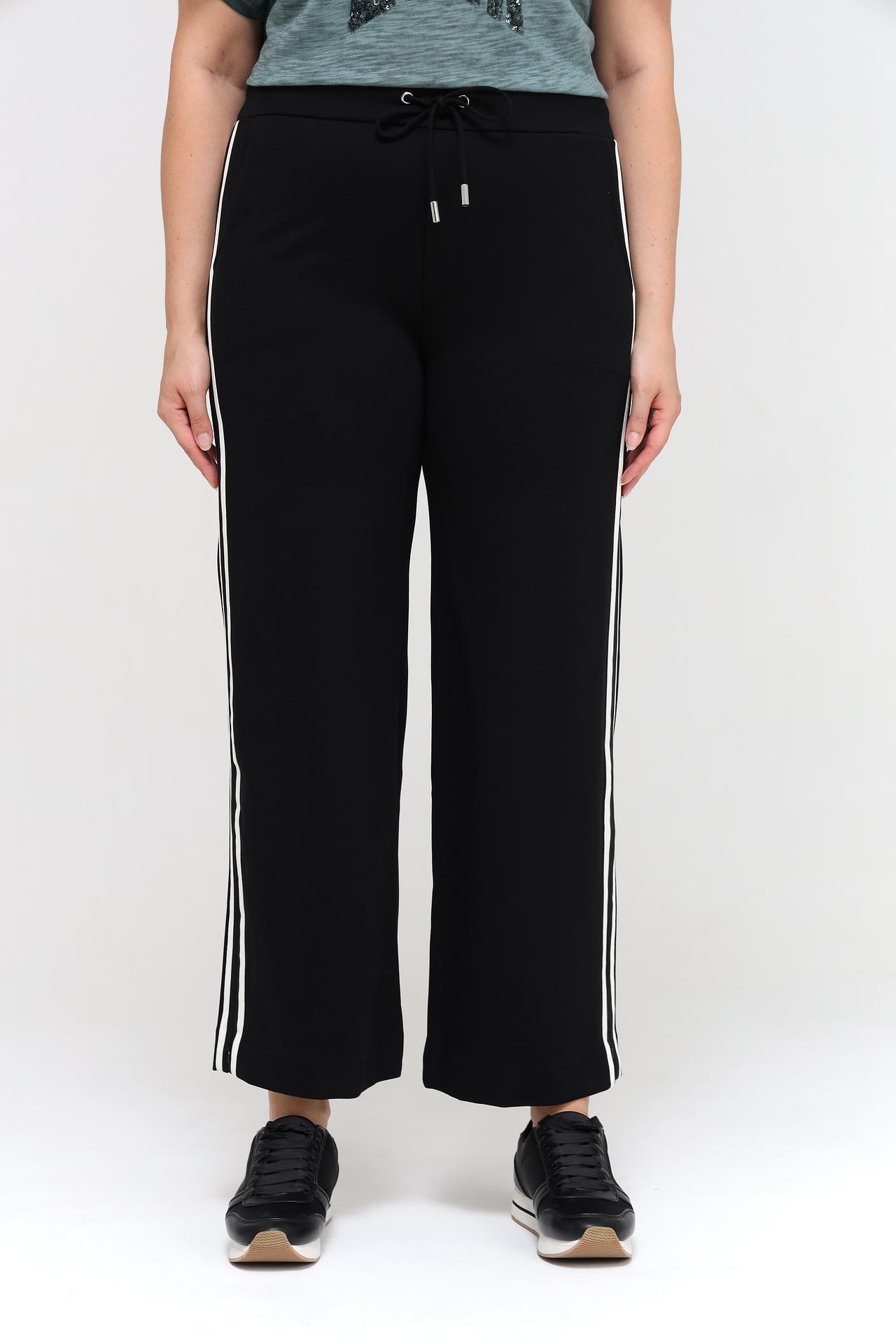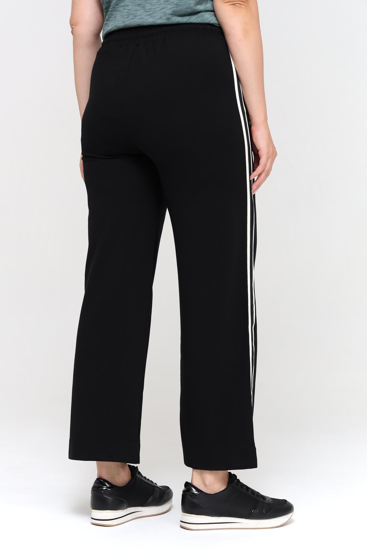 Элегантный черный цвет и контрастные белые лампасы по бокам придают модели актуальный спортивный шик. Удобный пояс на кулиске с металлическими наконечниками позволяет регулировать посадку, а мягкая, приятная к телу ткань дарит ощущение комфорта в течение всего дня.