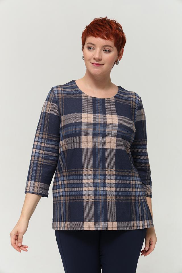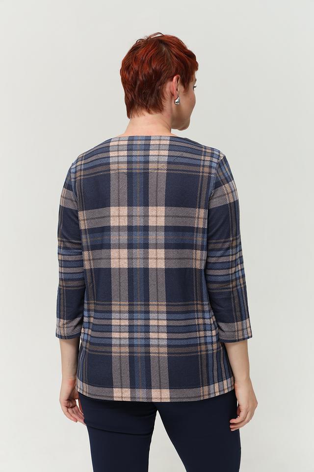 Пуловер имеет классический крой и круглый вырез горловины. Его отличает яркий клетчатый принт в синих, бежевых и коричневых тонах, который придаёт изделию особый шарм.