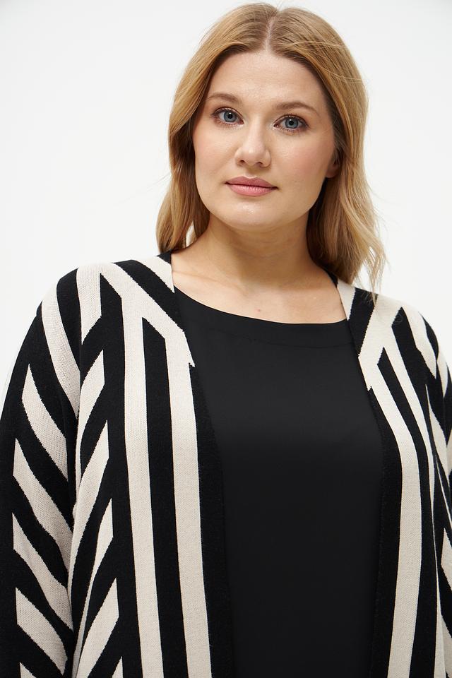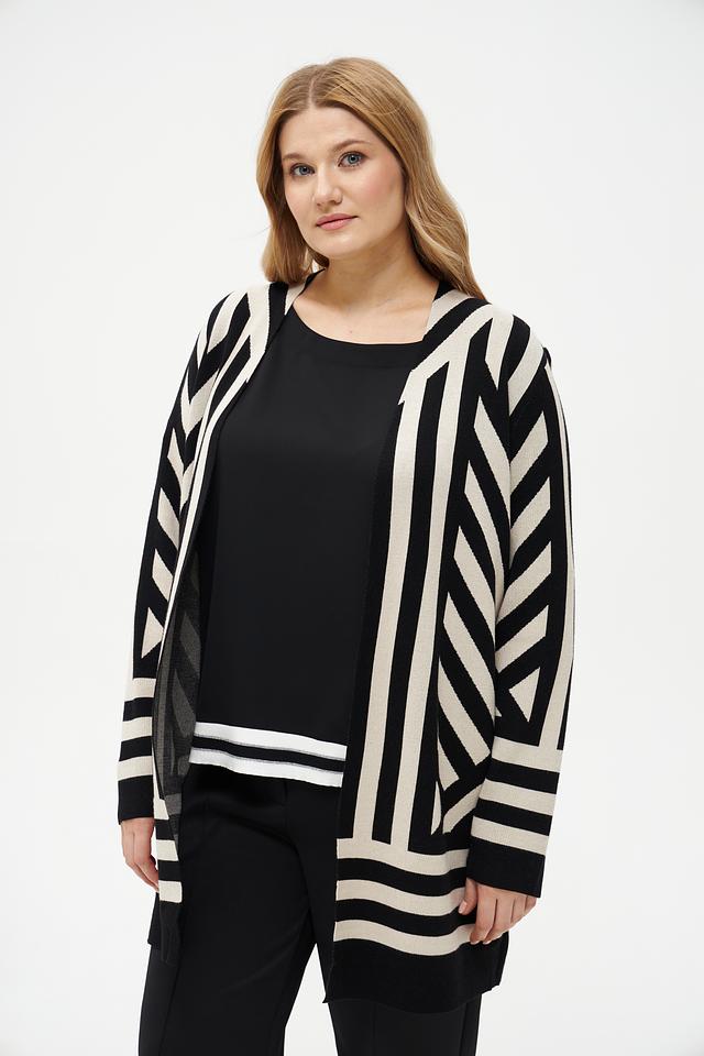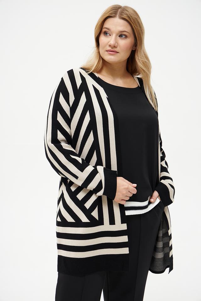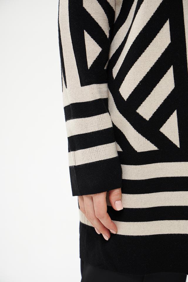 Этот жакет от Via Appia станет отличным дополнением к вашему гардеробу. Он выполнен в оригинальном дизайне с геометрическим узором из черных и бежевых полос, что делает его ярким акцентом в любом образе.