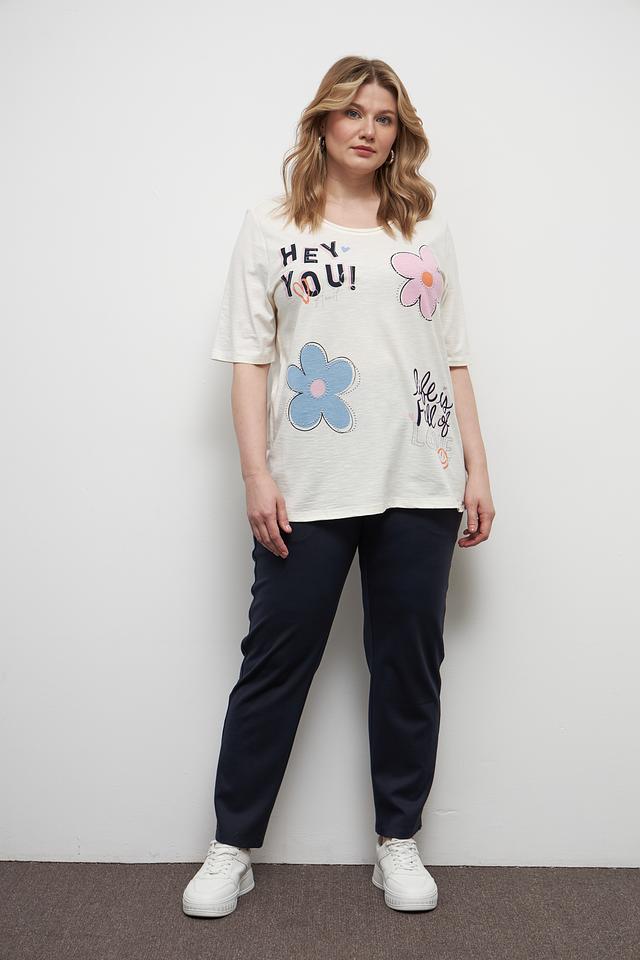 Эта стильная футболка от Via Appia станет отличным дополнением к вашему гардеробу. Футболка выполнена в кремовом цвете и украшена яркими аппликациями в виде цветов – розового, голубого и оранжевого. На передней части футболки расположены надписи "HEY YOU!" и "life is full of LOVE" с изображением смайлика.