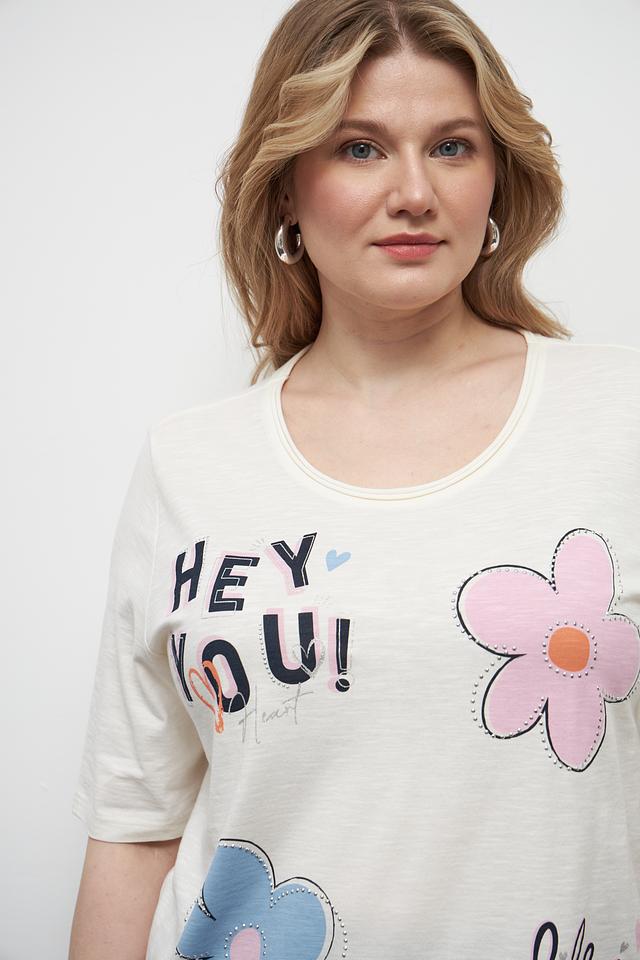 Женская футболка Via Appia кремового цвета с яркими цветочным принтом и позитивными надписями. Изготовлена из 100% хлопка, обеспечивающего комфорт и воздухопроницаемость. Состав: хлопок 100%