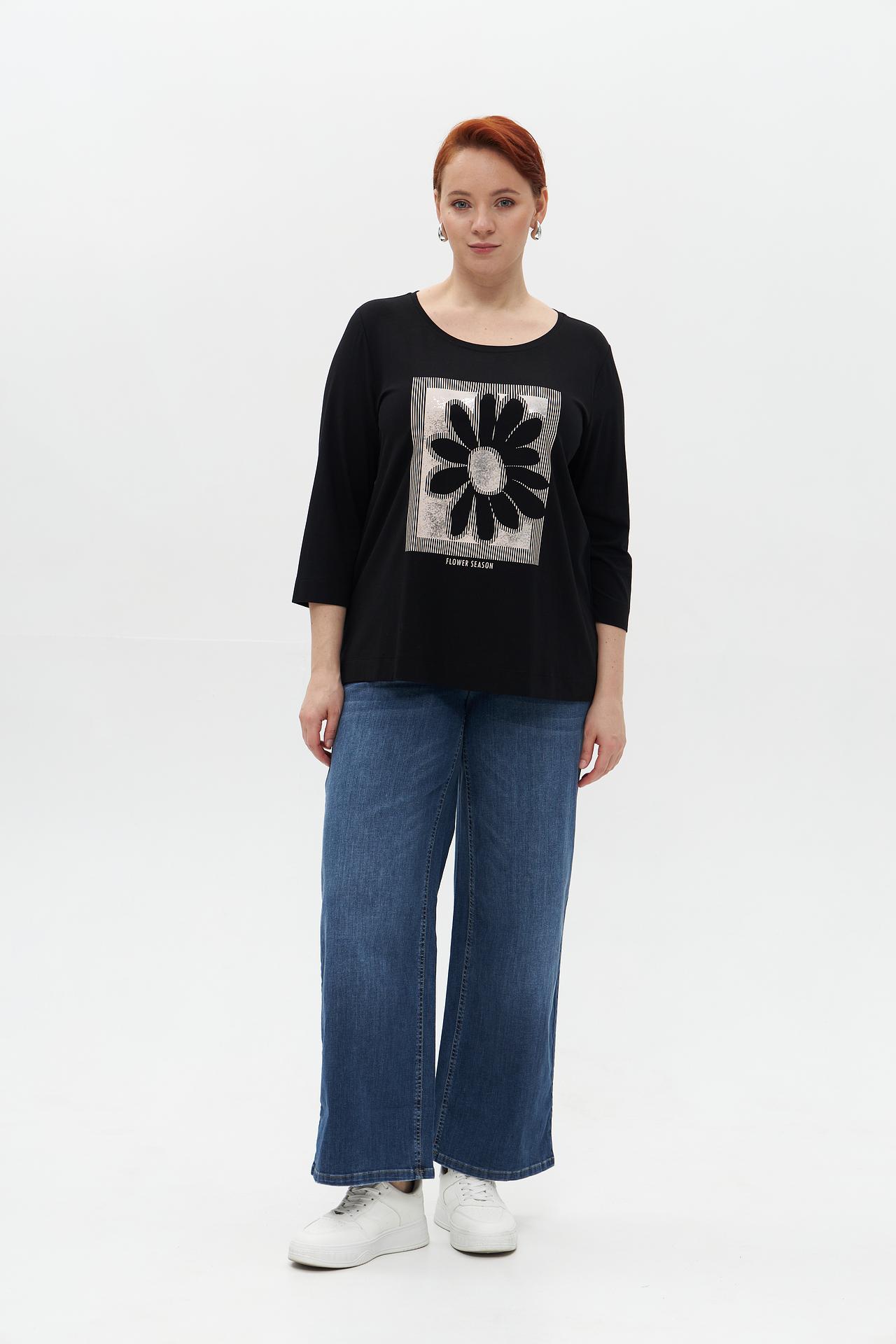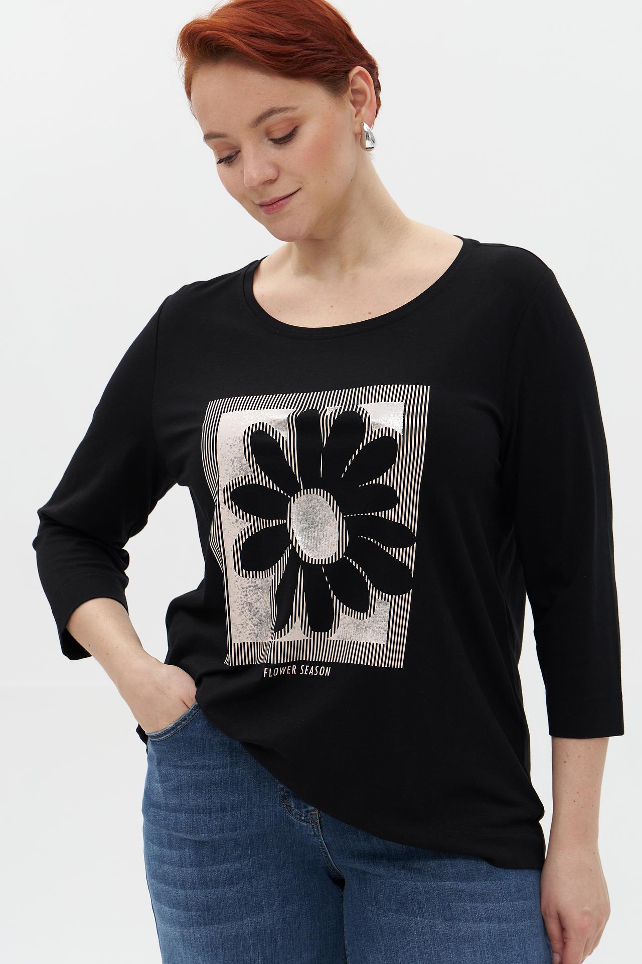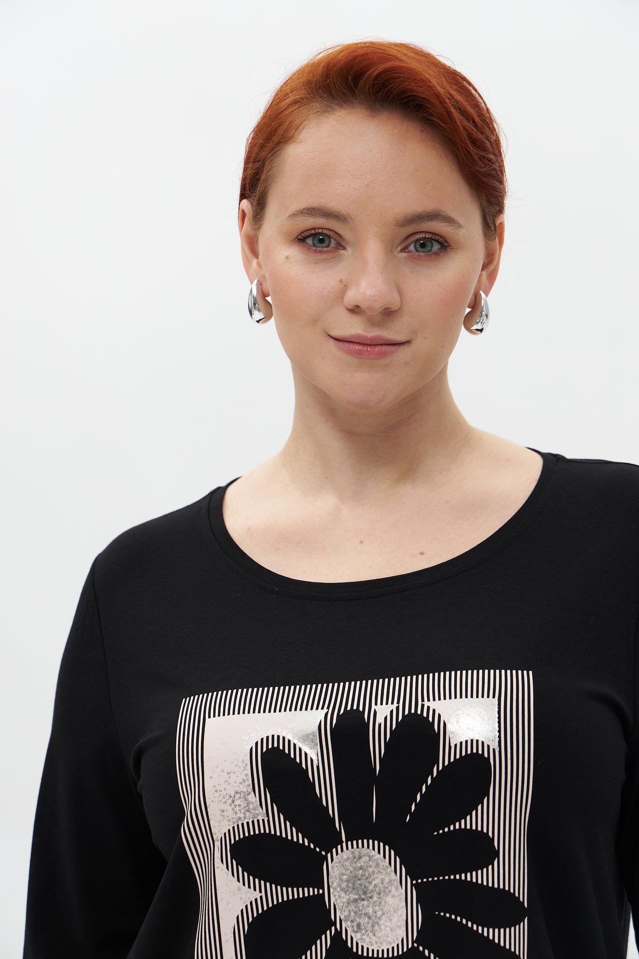 - Дизайн: Классический чёрный цвет и лаконичный крой делают лонгслив универсальным. Оригинальный принт с изображением цветка, выполненный с использованием серебристых элементов, придаёт модели акцентность и современный вид.