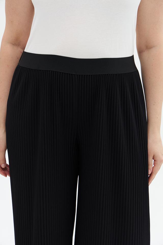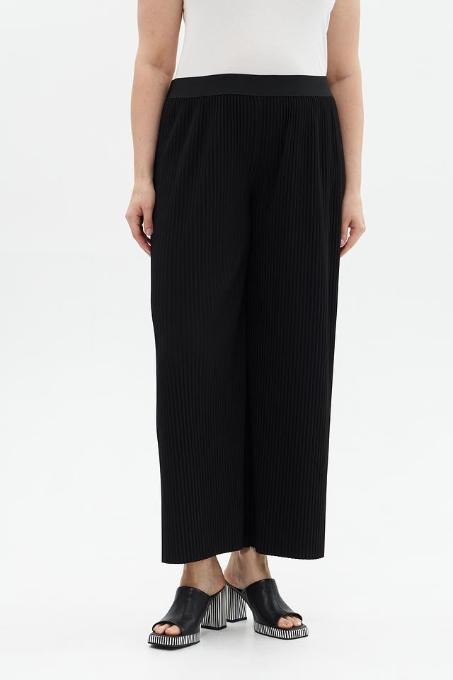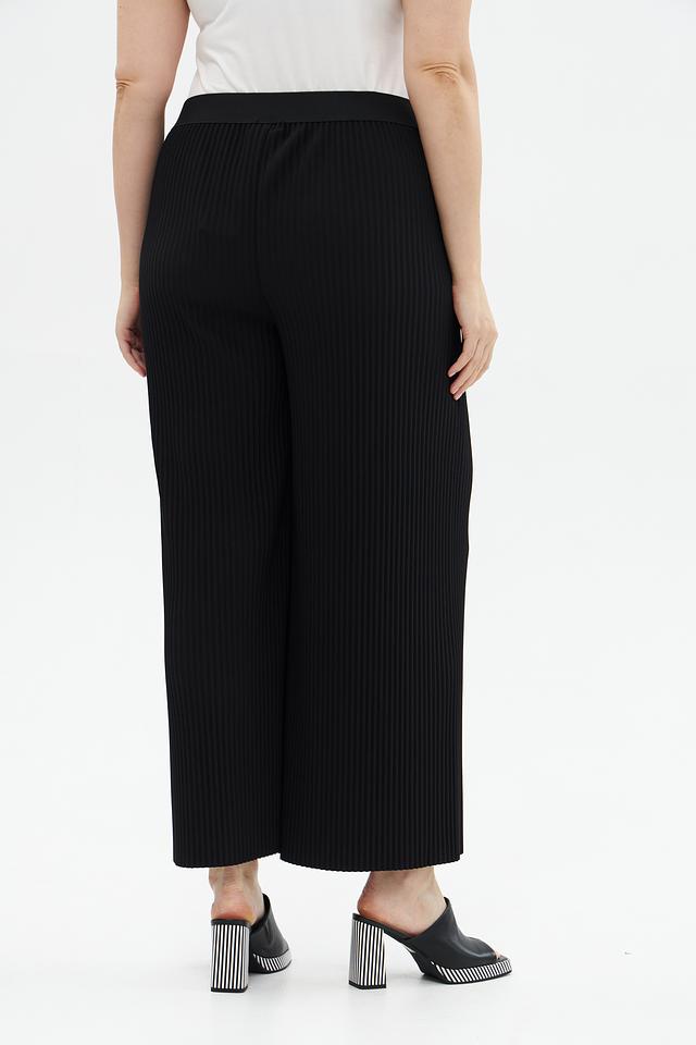 Брюки имеют завышенную талию, которая визуально удлиняет ноги и подчеркивает фигуру. Плейцы добавляют изысканности и создают эффект лёгкости и воздушности. Широкий крой палаццо обеспечивает максимальный комфорт и свободу движений.