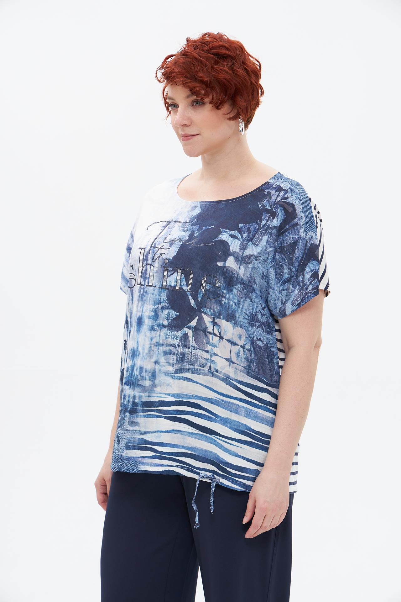 - Уникальный дизайн. Модель отличается оригинальным абстрактным принтом в сине-белых оттенках, дополненным надписью со стразами и контрастной полосатой спинкой. Это придает футболке особый шарм и позволяет выделиться из толпы.