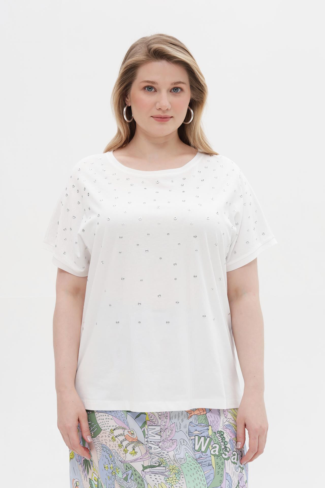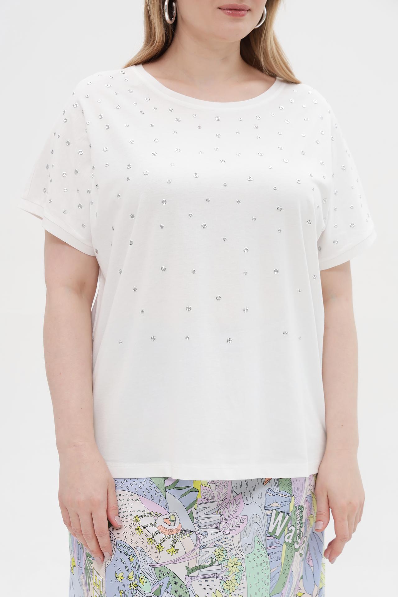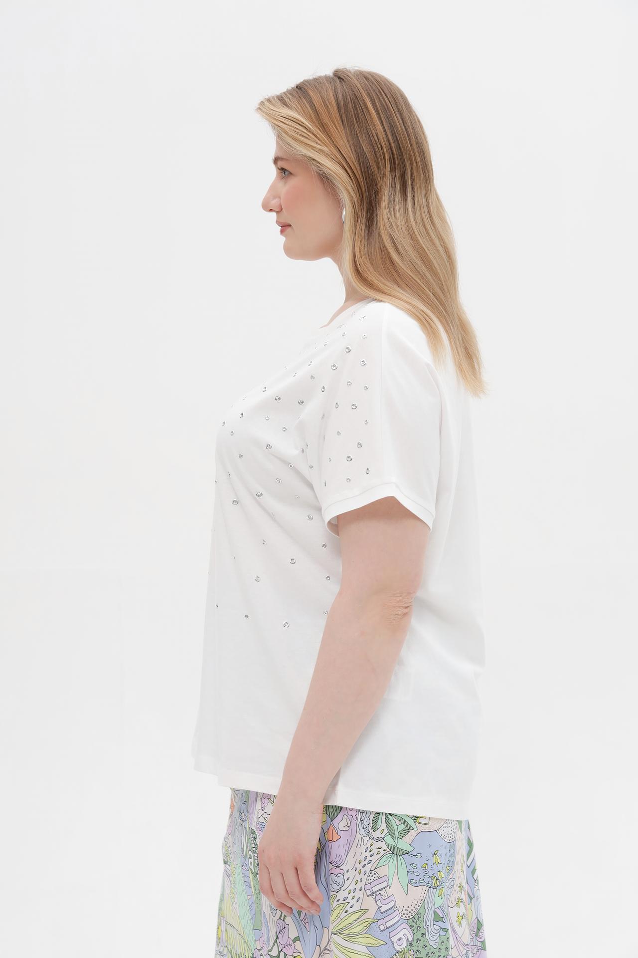 - Элегантный декор. Передняя часть и рукава футболки украшены россыпью мелких стразов, придающих изделию утонченное сияние и особый шарм.