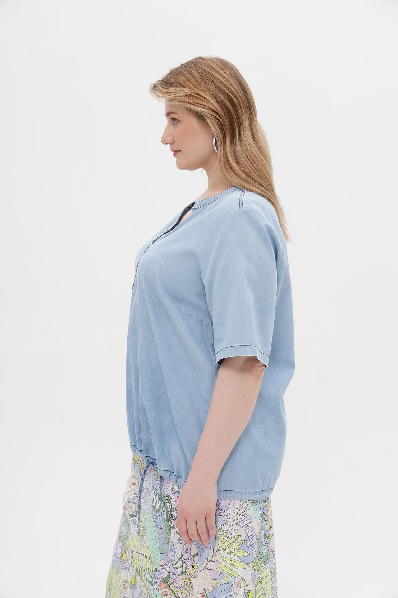 Блуза Via Appia из 100% хлопка — идеальное решение для комфортного и стильного образа на каждый день. Модель прямого кроя в светло-голубом цвете имитирует деним, предлагая универсальность и лёгкость. Элегантный V-образный вырез с короткой планкой на пуговицах добавляет женственности, а короткие рукава обеспечивают свободу движений.