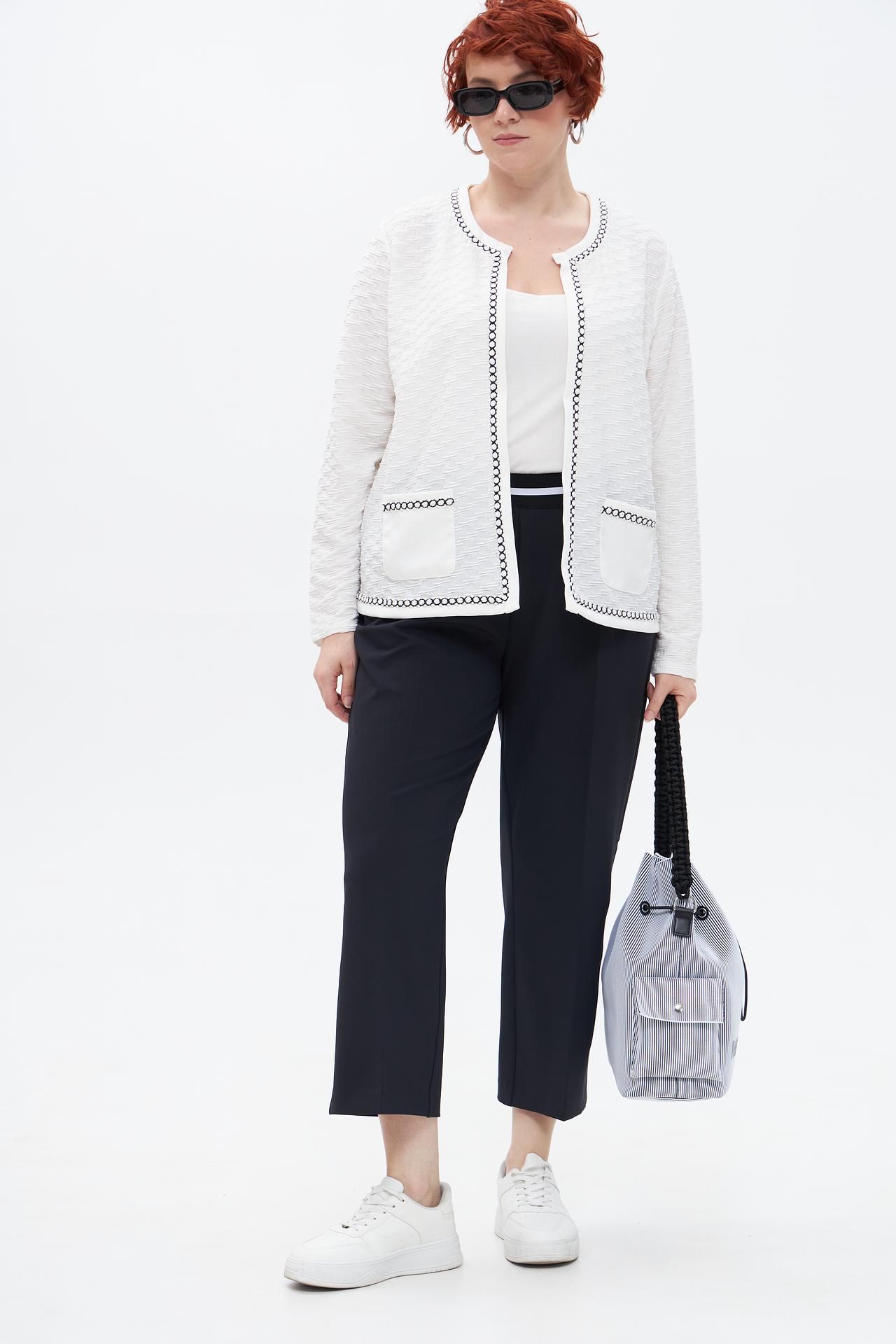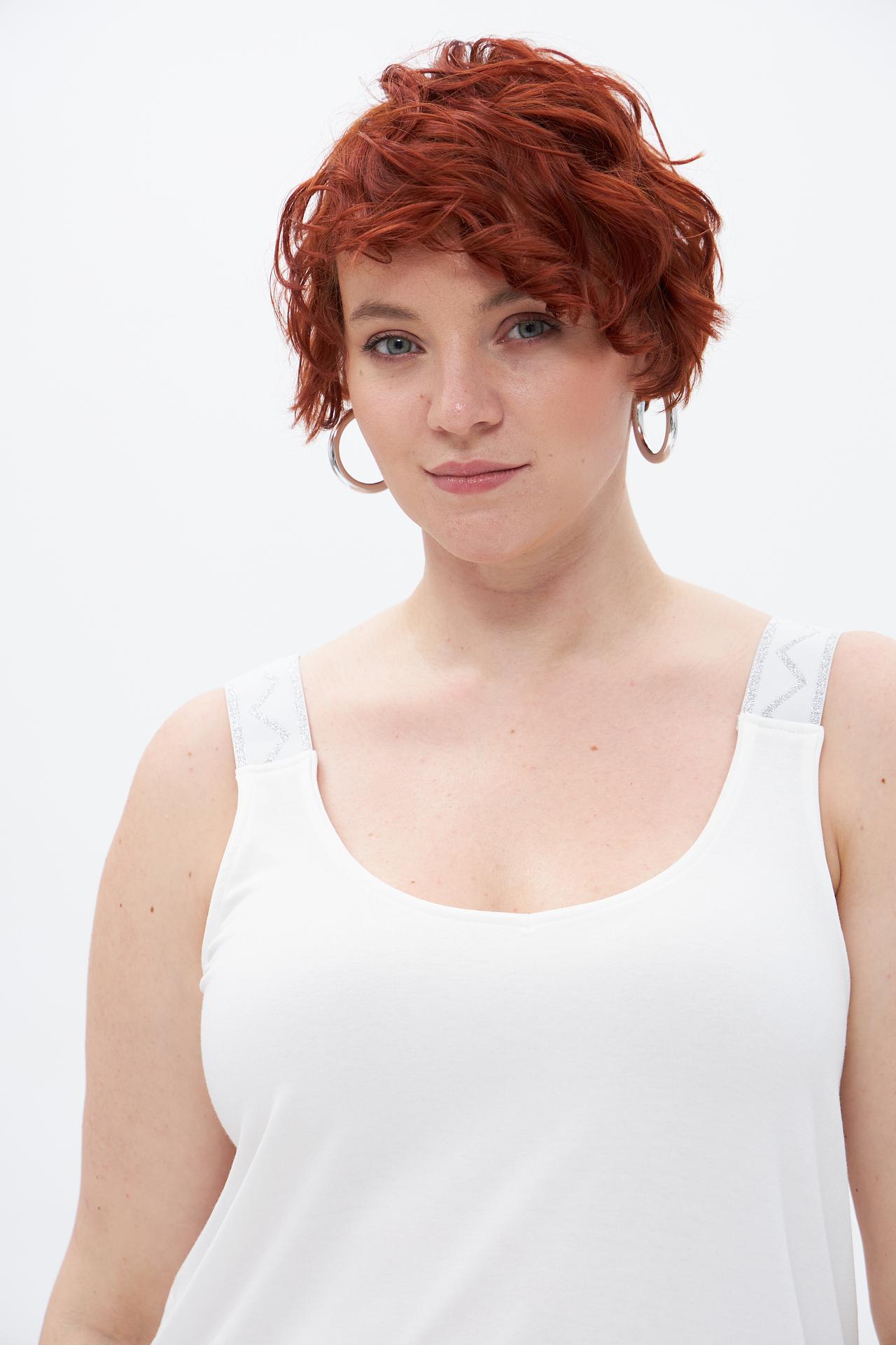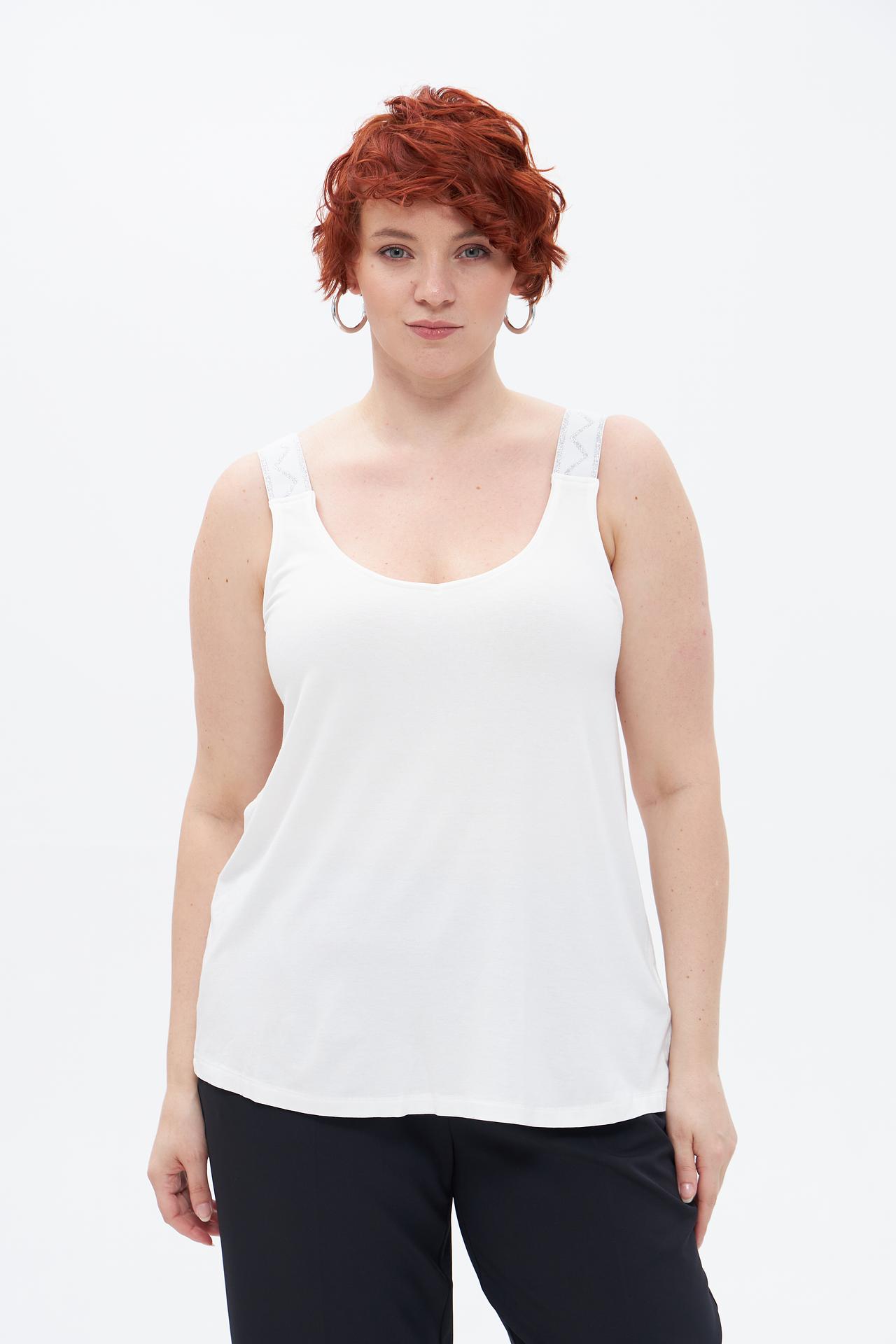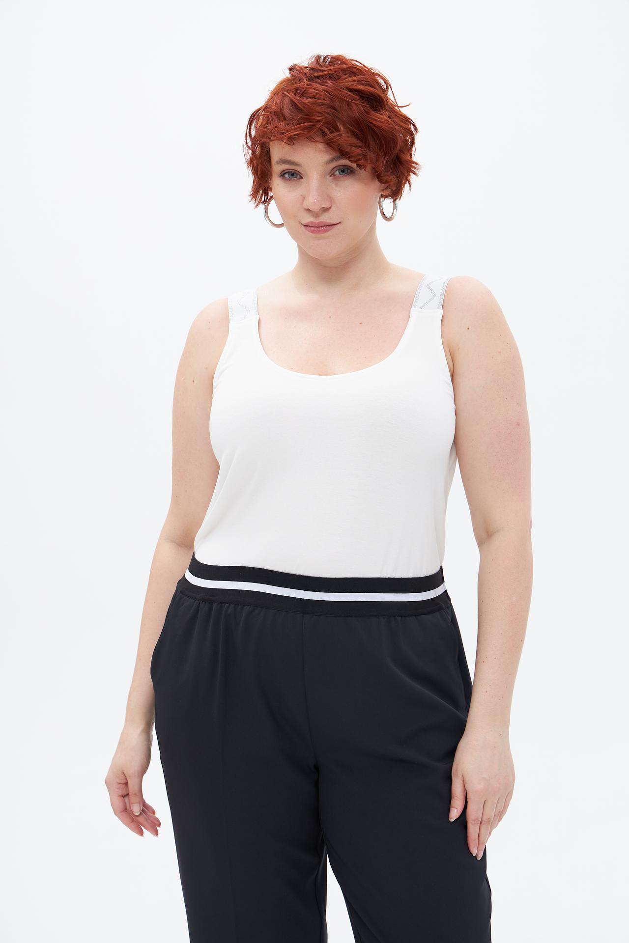 - Стильный дизайн: Классический крой и универсальный белый цвет делают этот топ незаменимым элементом для создания различных образов. Декоративные бретели с ненавязчивым серебристым узором добавляют изысканности и подчеркивают элегантность модели.