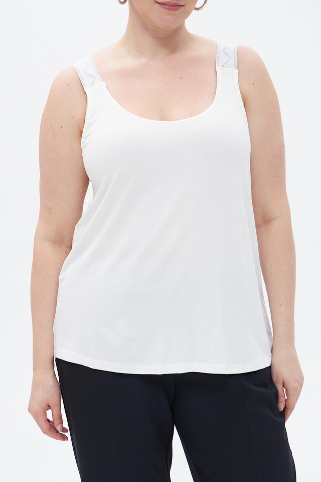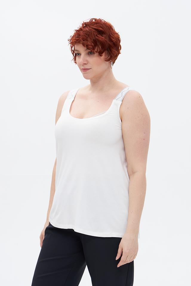 Белый топ Via Appia из вискозы с тонкими бретелями. Модель имеет округлый вырез и свободный крой, обеспечивающий комфорт в носке. Состав: 94% вискоза, 6% эластан. Состав: вискоза 94%, эластан 6%