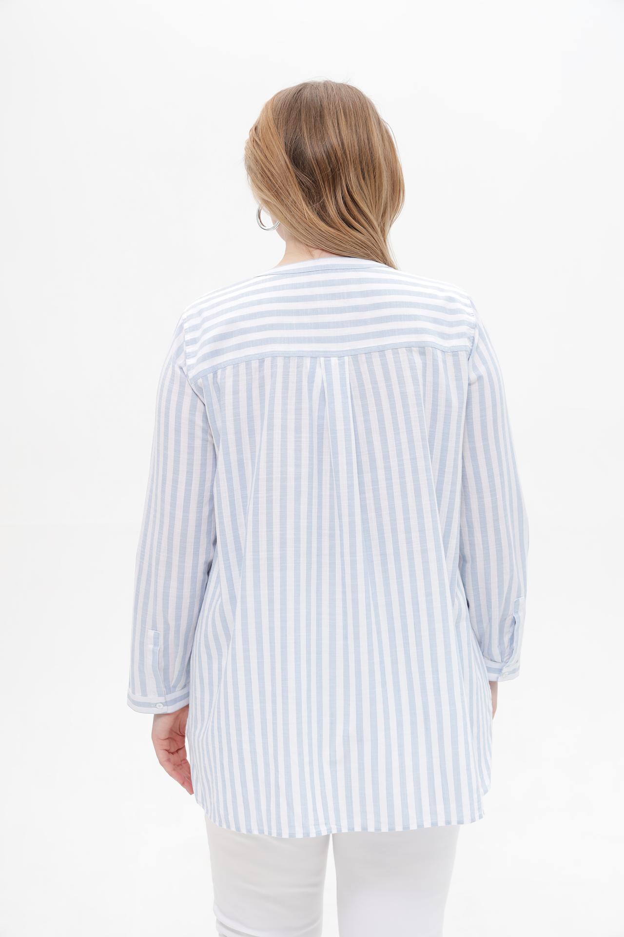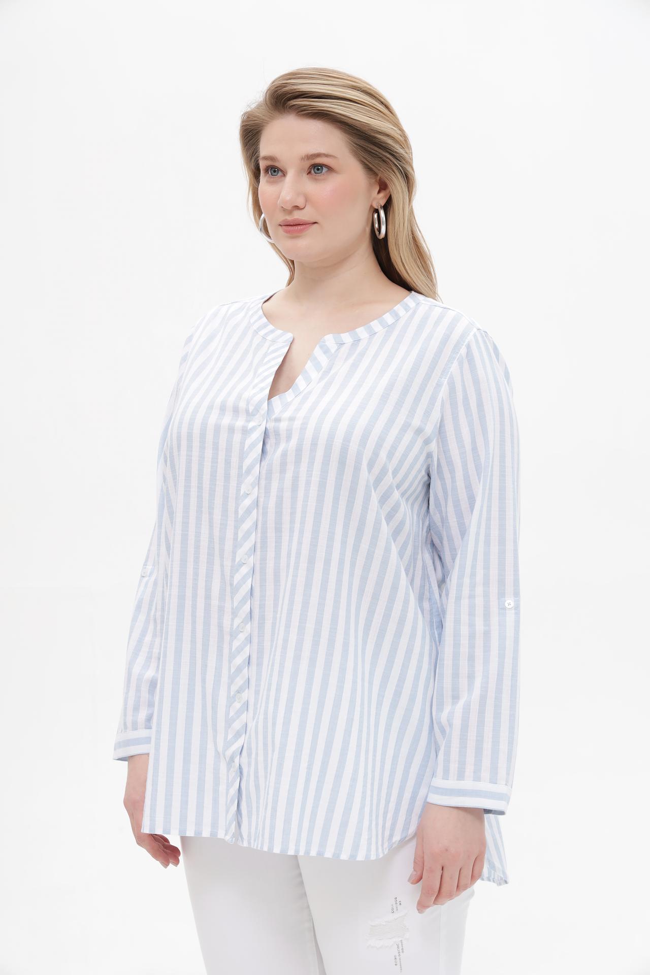 Блуза застегивается на пуговицы, что позволяет регулировать глубину выреза. Рукава 3/4 с возможностью фиксации на пуговицу добавляют практичности и универсальности этой модели. Благодаря натуральному составу ткани, блуза прекрасно пропускает воздух и приятна к телу.