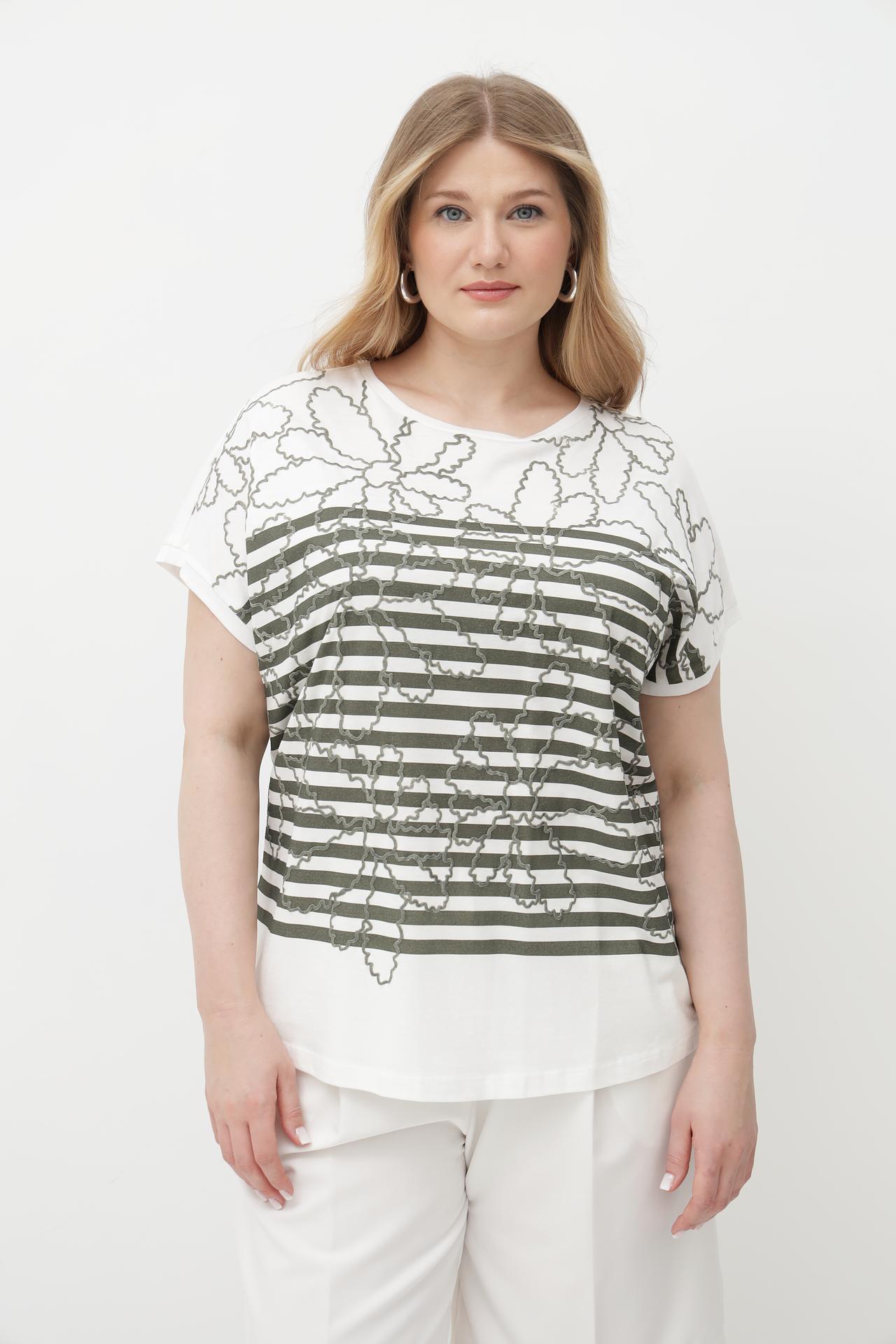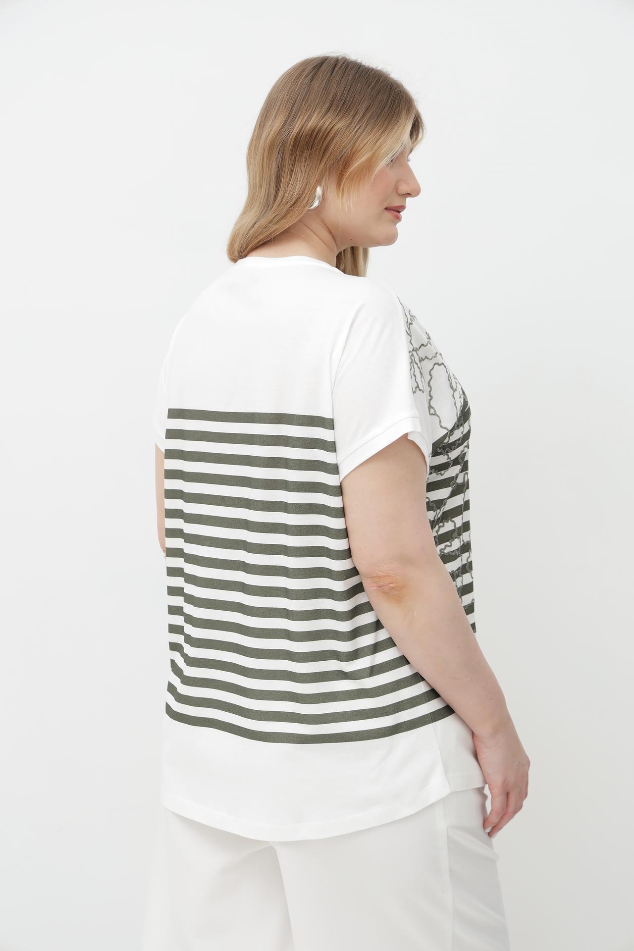 - Актуальный дизайн. Белая футболка дополнена эффектным принтом в виде горизонтальных полосок глубокого зеленого оттенка, поверх которых наложен абстрактный графический узор. Это придает изделию динамичность и современный вид, легко вписываясь в трендовые комплекты.