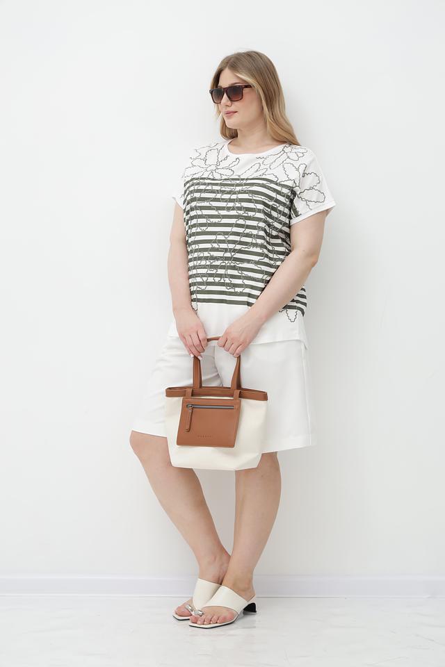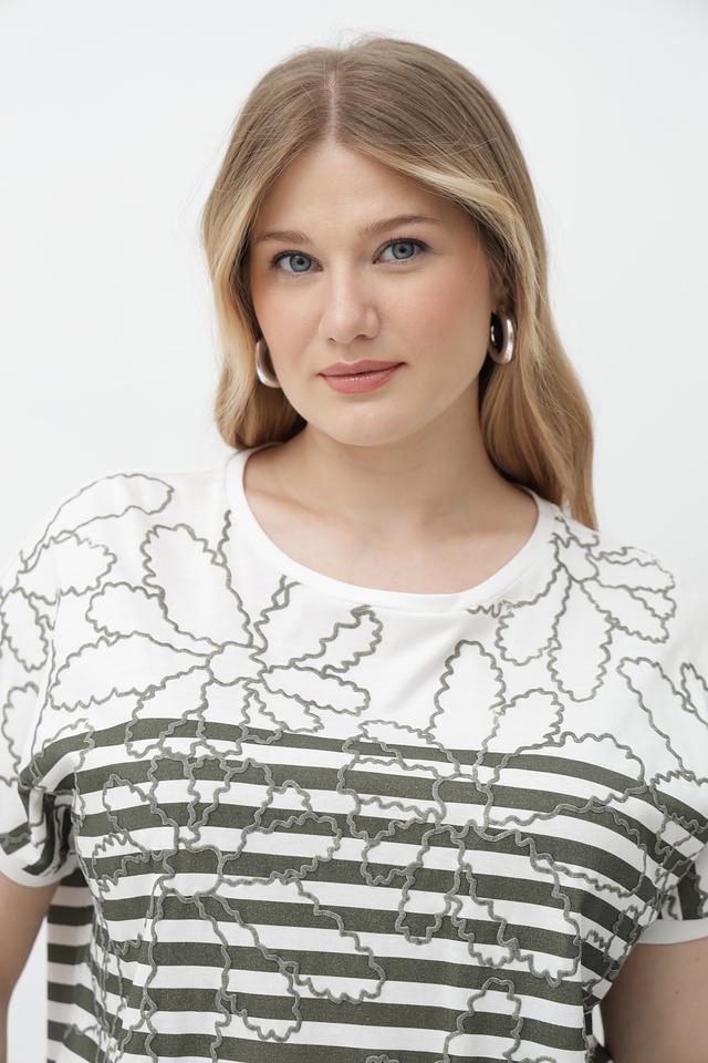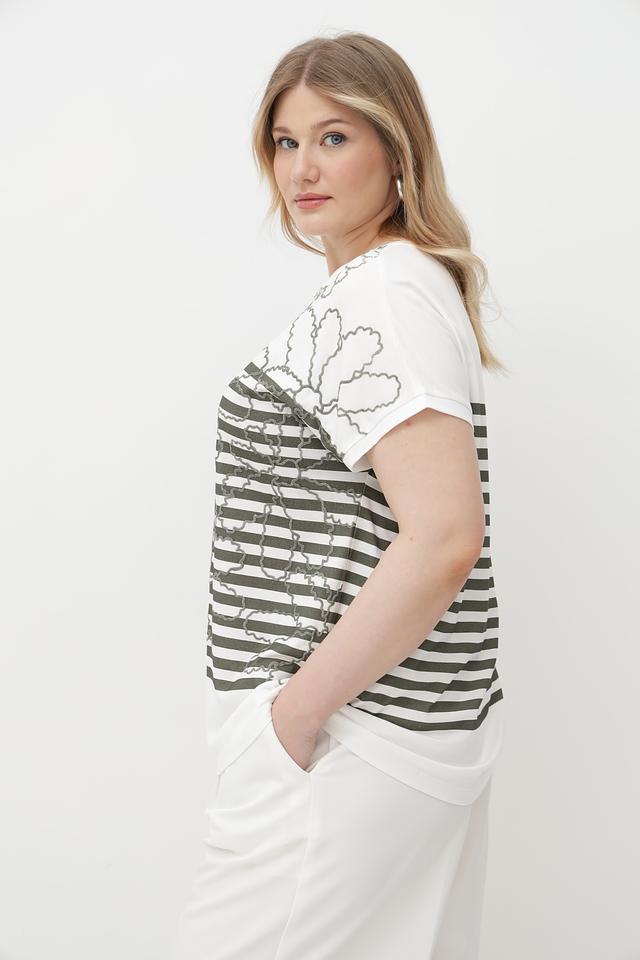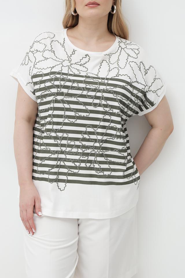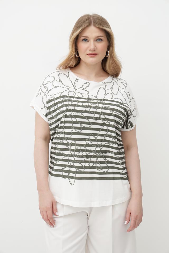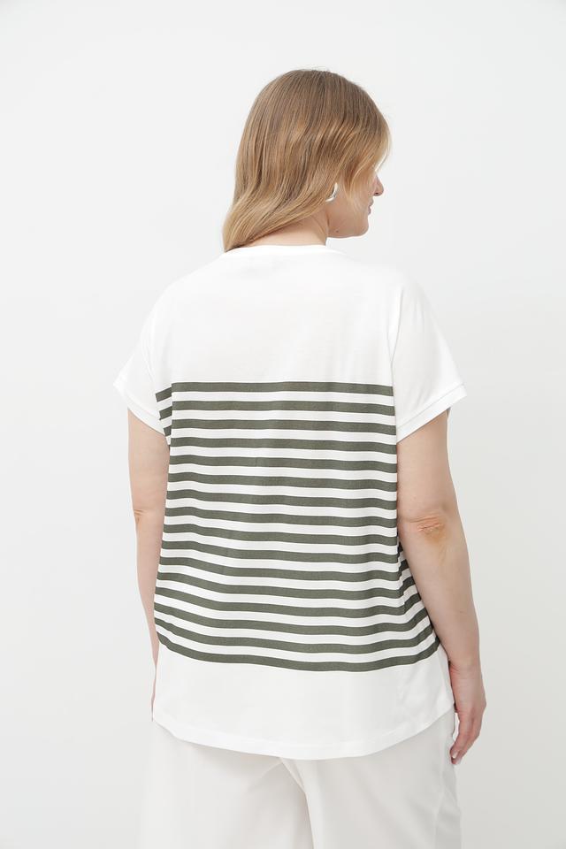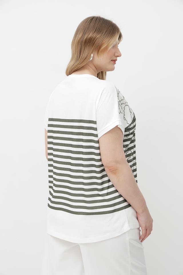 Футболка имеет короткий рукав и круглый вырез горловины. Привлекает внимание оригинальный принт, сочетающий в себе полоски и абстрактные элементы зелёного цвета.