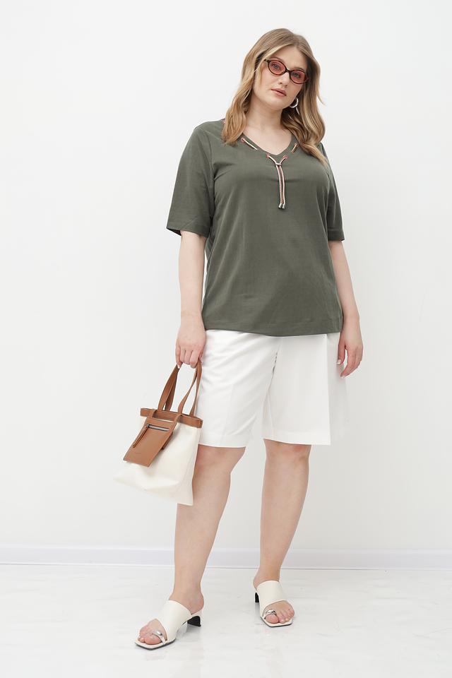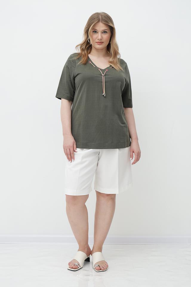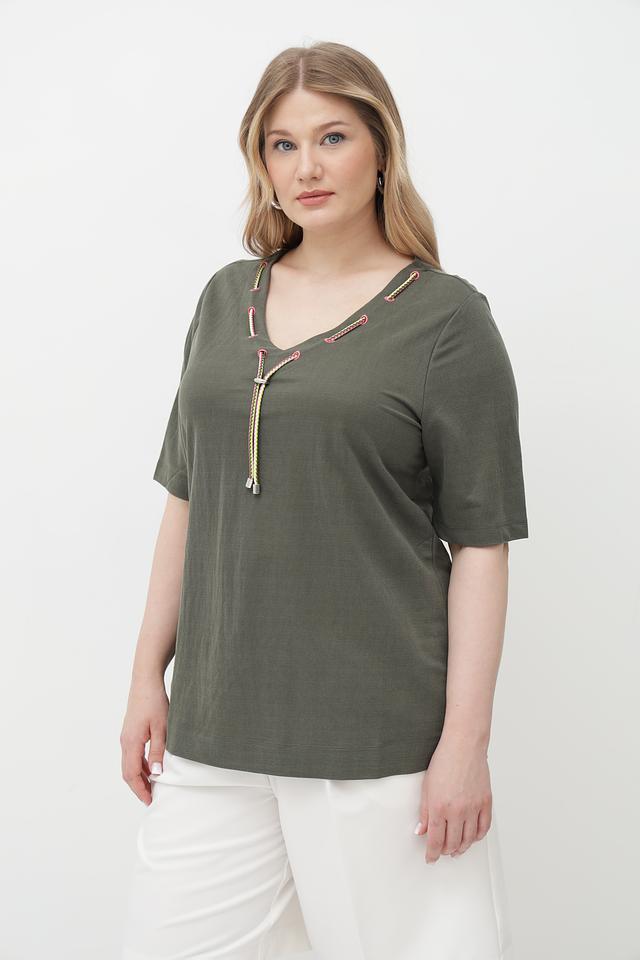 Женская футболка Via Appia оливкового цвета с оригинальной отделкой в виде завязок на V-образном вырезе. Изготовлена из мягкого и приятного к телу сочетания вискозы и полиамида. Состав: вискоза 50%, полиамид 50%