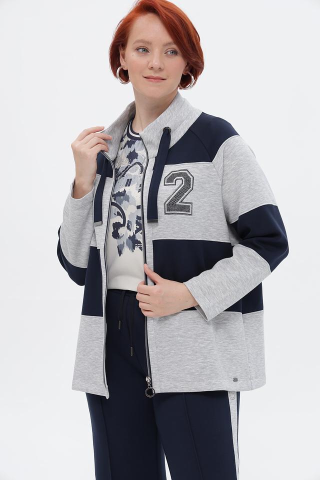 Жакет имеет удобную застежку-молнию, капюшон с кулисками и декоративный элемент в виде номера "2". Состав ткани включает вискозу, полиэстер и эластан, что обеспечивает приятные тактильные ощущения и хорошую посадку по фигуре.