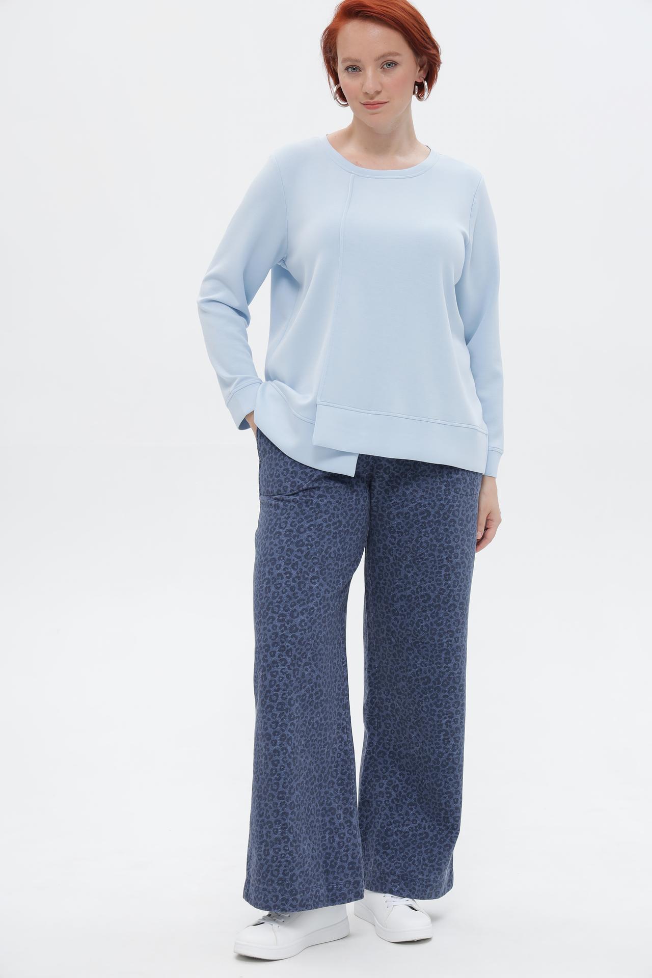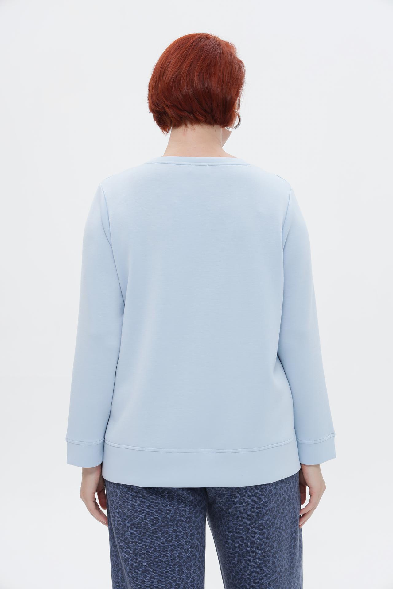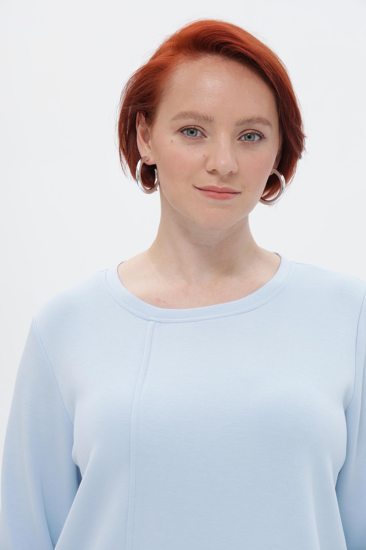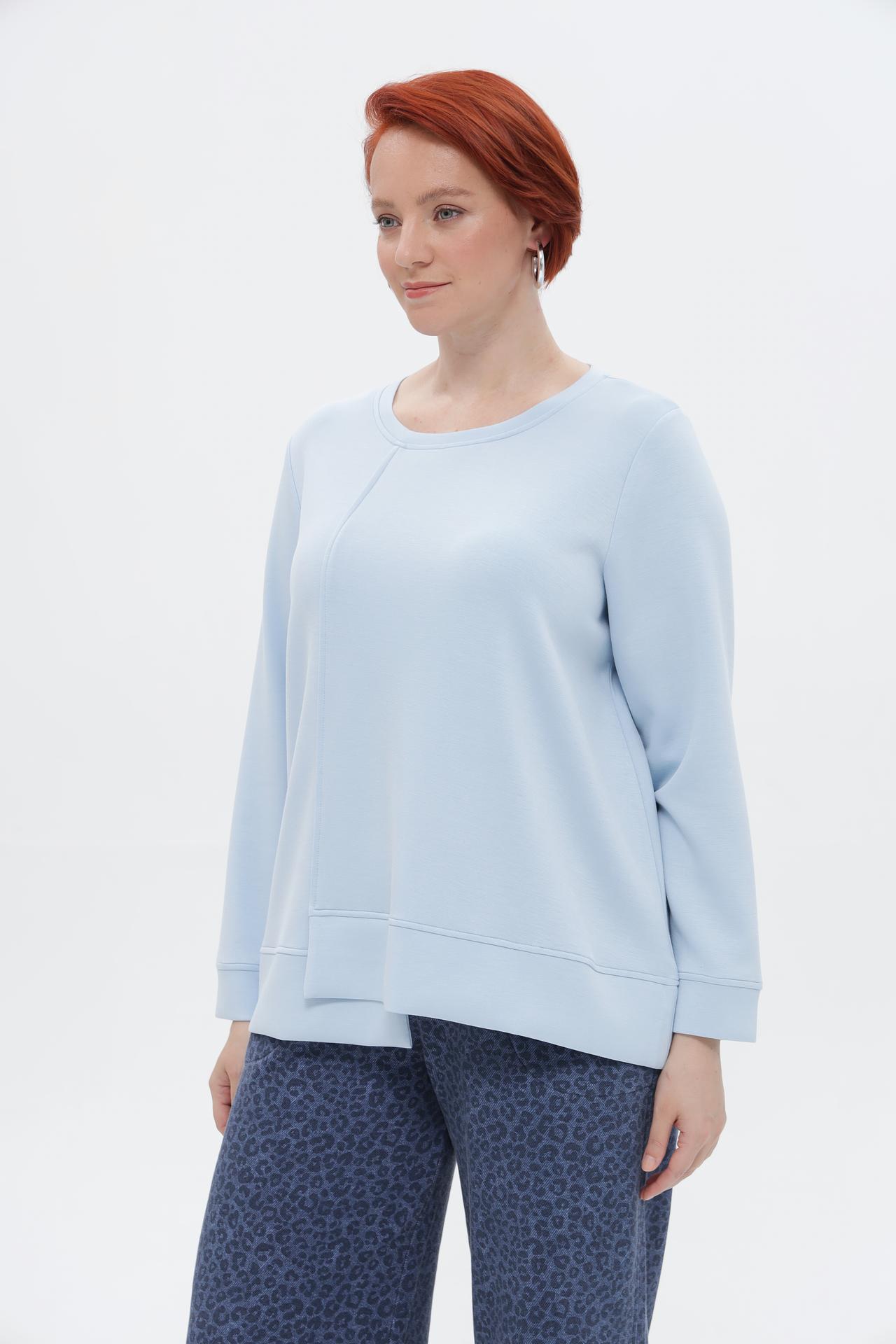 Нежный голубой оттенок и современный дизайн делают эту модель универсальной. Асимметричный крой с декоративной отстрочкой придает изделию особую изюминку и актуальность. Пуловер отлично сочетается как с классическими брюками, так и с более расслабленными вариантами.
