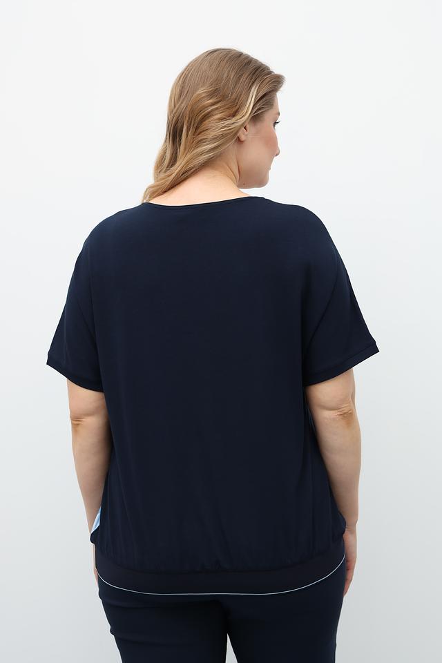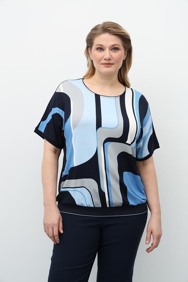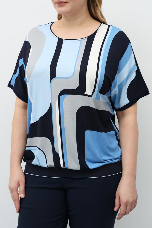 Блузка имеет короткий рукав и округлый вырез горловины, что делает ее универсальной для различных случаев. Свободный крой обеспечивает комфортную посадку по фигуре.
