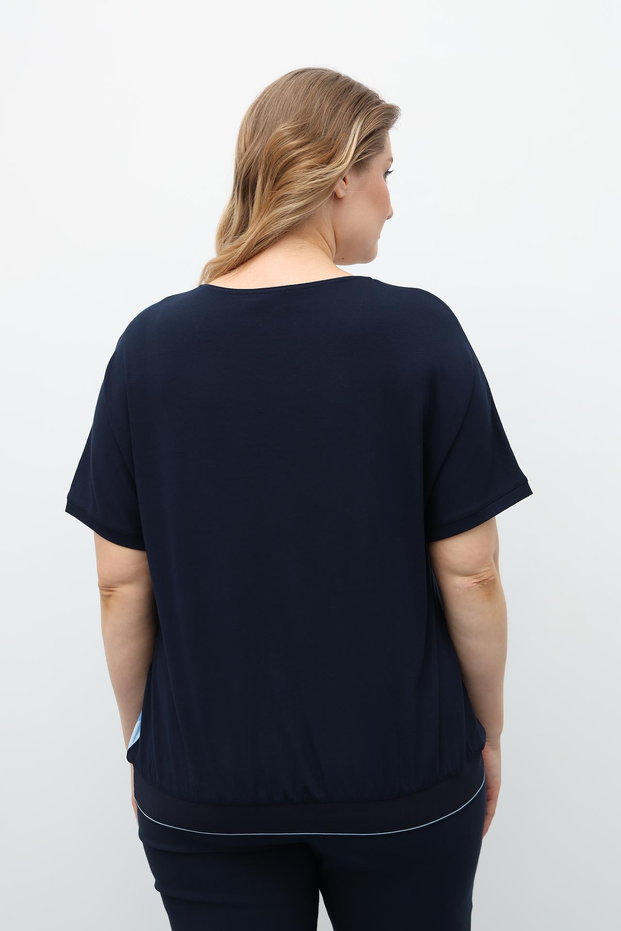 Привлекательный геометрический узор, сочетающий оттенки синего, голубого, серого и белого, придает блузе динамичность и современный вид. Широкая резинка по нижнему краю изделия обеспечивает аккуратное прилегание и формирует красивый силуэт. Рукав свободный, длиной до локтя, что создает расслабленный и женственный образ. Эта блуза идеально подходит для повседневной носки, сочетаясь как с классическими брюками, так и с джинсами.