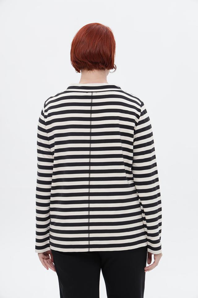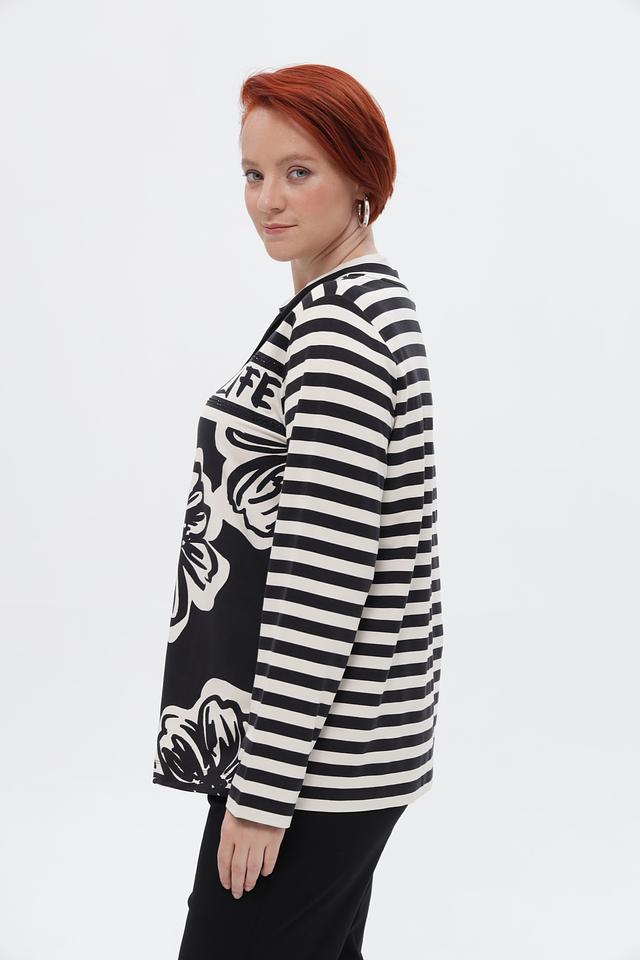 Стильный пуловер Via Appia в бело-чёрную полоску, украшенный крупным цветочным принтом и надписью. Модель с длинными рукавами и округлым вырезом горловины. Идеальный вариант для создания повседневного образа. Состав: вискоза 95%, эластан 5%