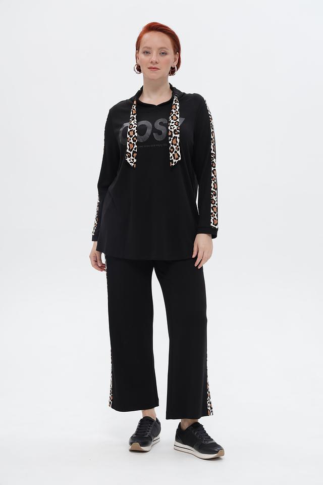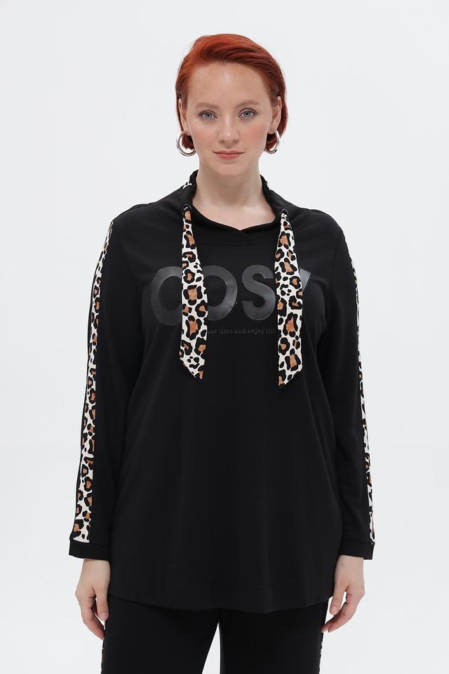 Чёрный пуловер Via Appia с капюшоном и контрастными леопардовыми полосками на рукавах. Удобный и стильный выбор для создания повседневных образов. Изготовлен из мягкой ткани. Состав: вискоза 84%, полиэстер 14%, эластан 2%