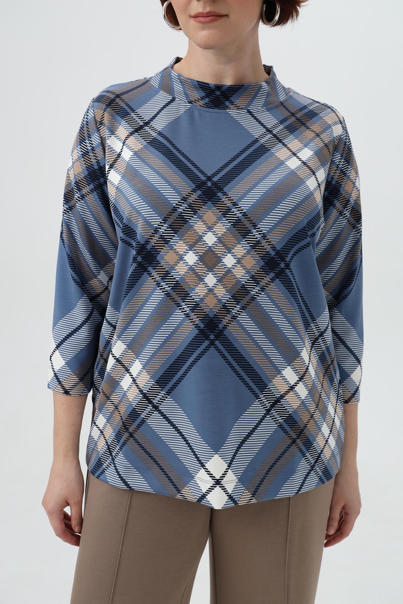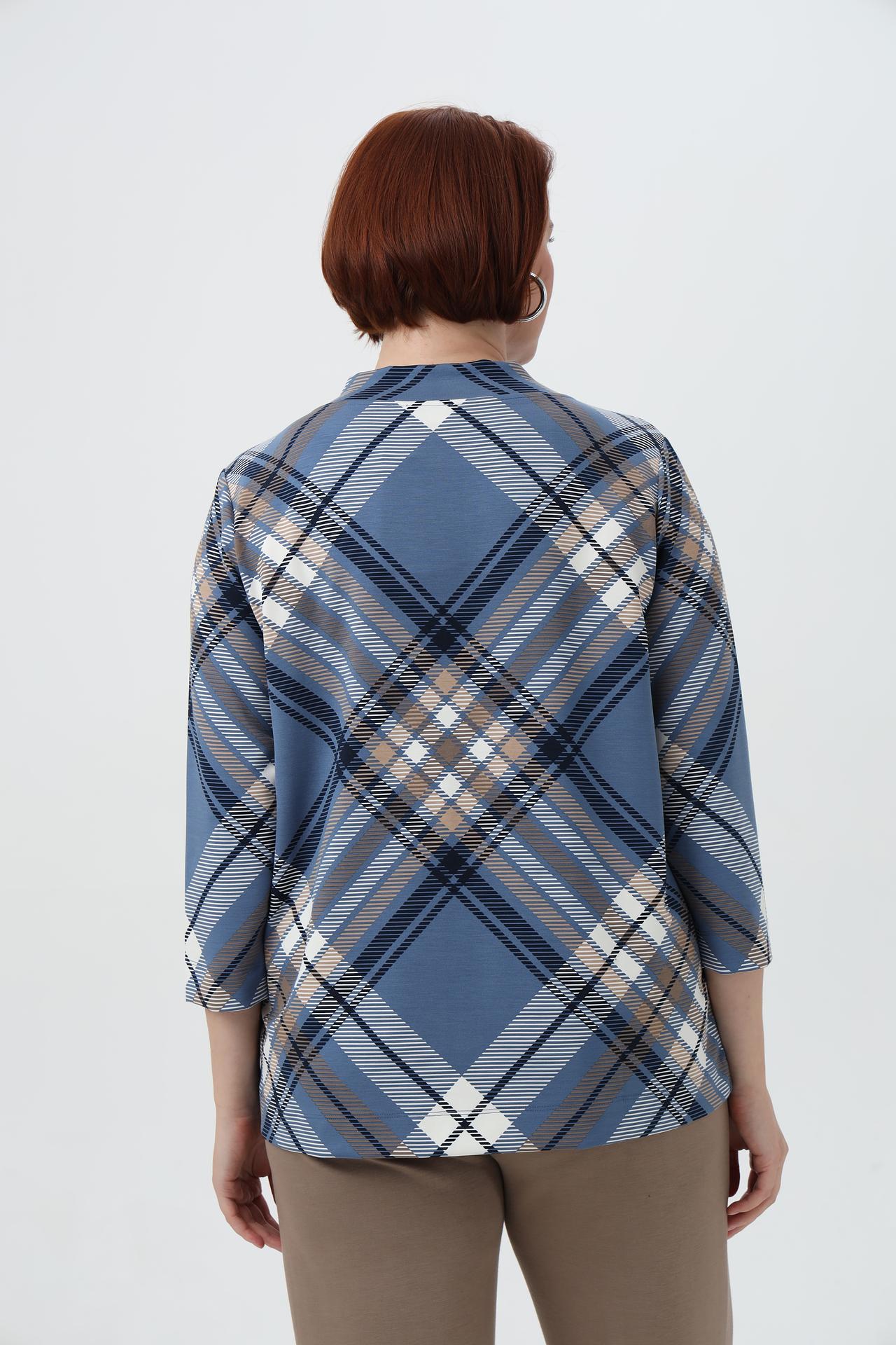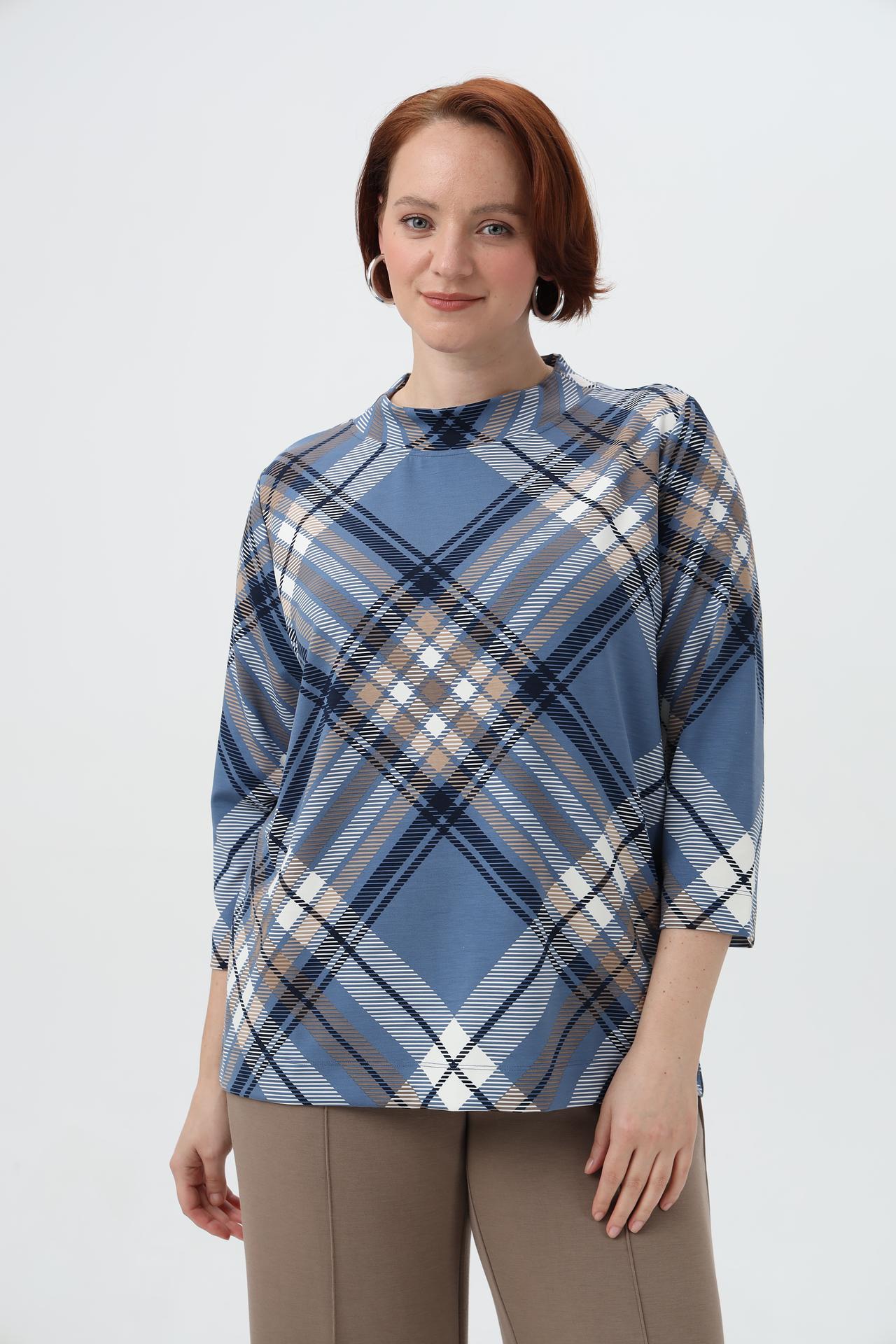 - Дизайн: Классическая клетка в синих, бежевых и белых тонах. Этот универсальный принт подходит для создания как деловых, так и повседневных образов.