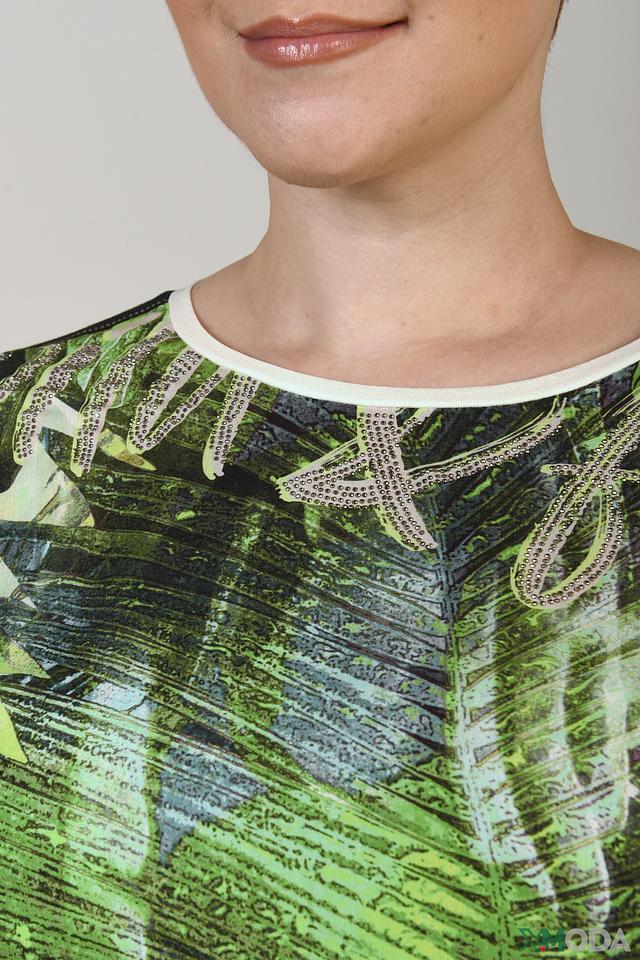 Основной цвет футболки – зеленый, с эффектным тропическим принтом, изображающим пальмовые листья. Вокруг горловины и на плечах расположена декоративная отделка из страз, придающая изделию изысканность и блеск.