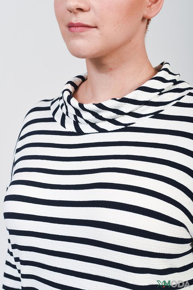 Джемпер имеет прямой крой, слегка завышенную горловину-стойку и рукава 3/4. Высокий воротник дополнен небольшим декоративным узлом спереди. Изготовлен из приятной к телу вискозы, с добавлением полиэстера и эластана для сохранения формы и комфорта в носке.