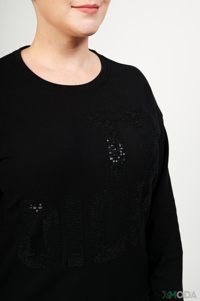 Пуловер имеет классический крой с круглым вырезом горловины и длинными рукавами. Передняя часть украшена крупным логотипом бренда, выполненным в виде аппликации с блестками, что придает изделию особый шарм и индивидуальность.