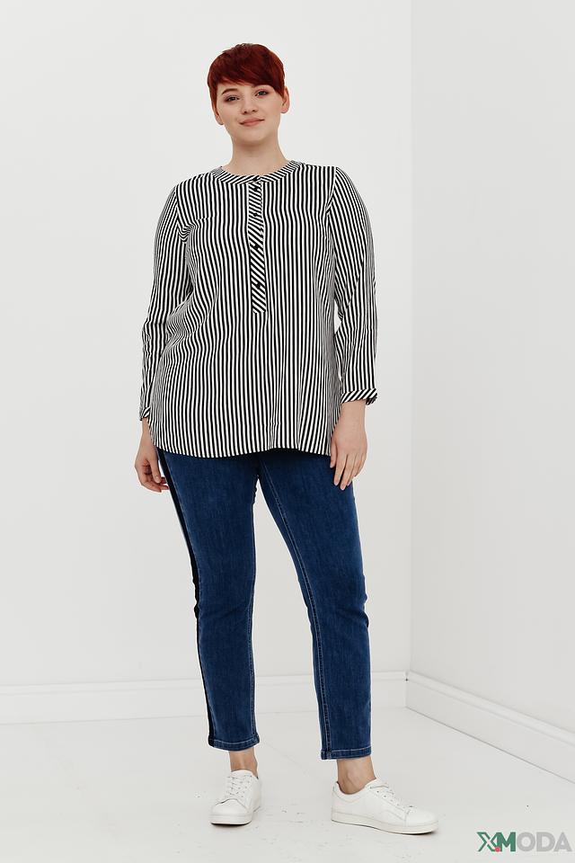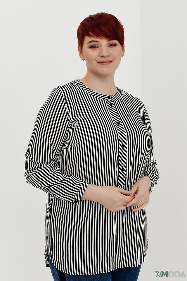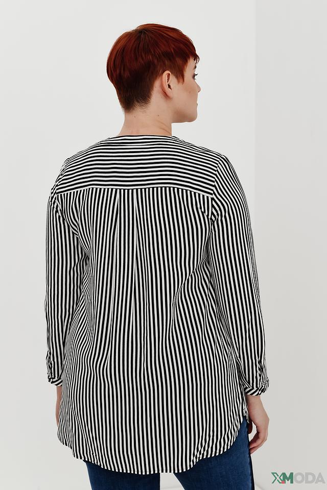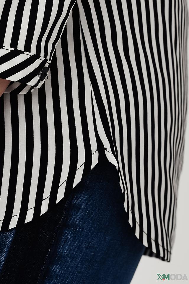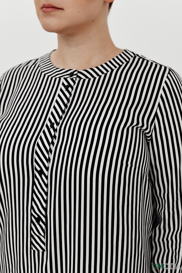 Блуза имеет классический крой с рукавами три четверти и круглым вырезом горловины. Особенностью модели является вертикальная полоска чёрного и белого цвета, которая визуально вытягивает силуэт.