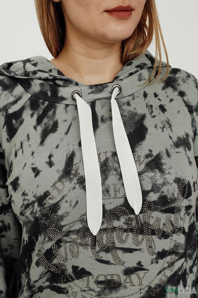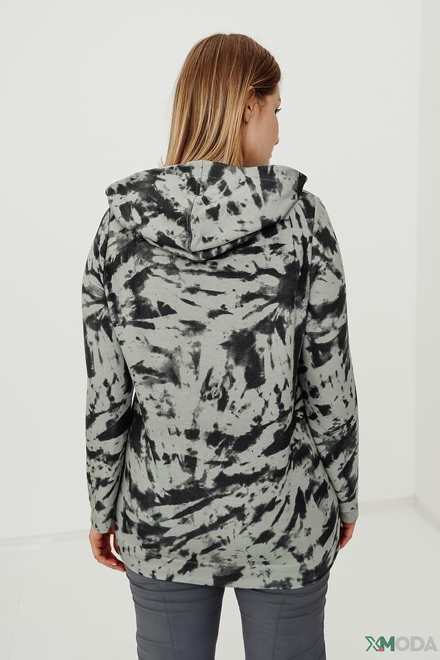 Пуловер имеет свободный крой, капюшон и длинные рукава. Его украшает эффектный принт в виде размытых пятен серого и черного цветов, создающий современный и динамичный образ.