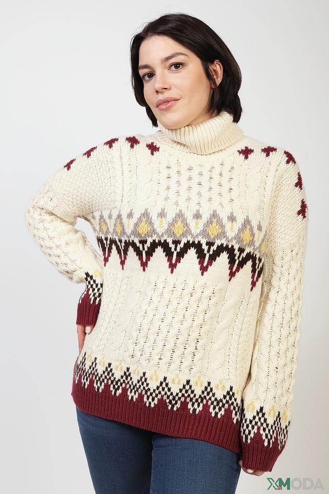 Основной цвет водолазки – кремовый, который служит идеальным фоном для яркого жаккардового узора в виде полосок. Узор выполнен в сочетании бордового, серого и бежевого цветов, что придает изделию оригинальность и выразительность.