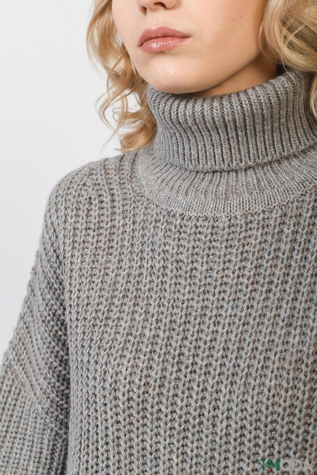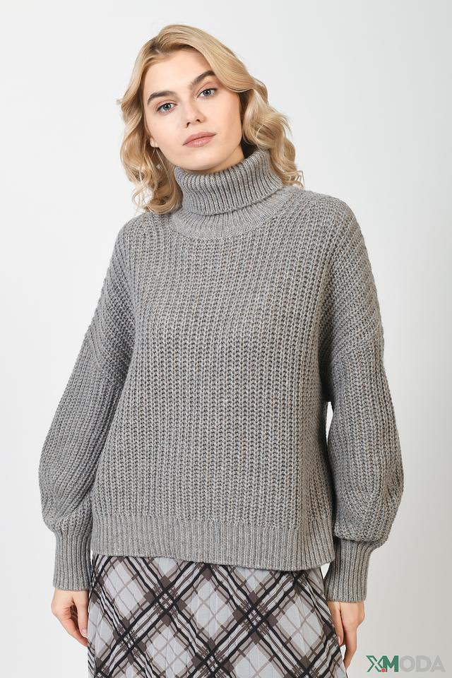 Свитер имеет свободный крой, который не сковывает движений, а рукава-фонарики добавляют образу оригинальности. Высокий воротник защищает от ветра и холода, а крупная вязка придает изделию текстуру и объем.