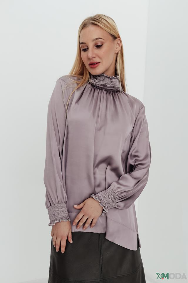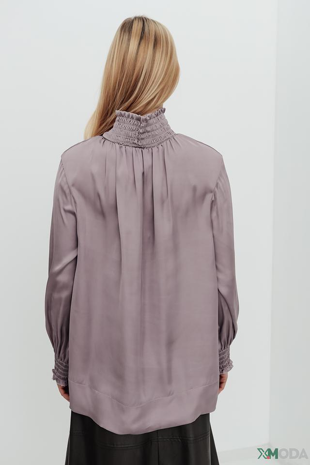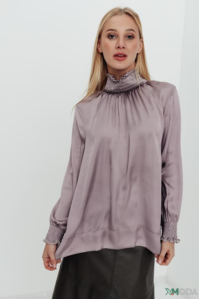 Модель отличается оригинальным дизайном: воротник-стойка с рюшами добавляет образу романтичности, а рукава с оборками придают лёгкость и воздушность. Блуза имеет свободный крой, который обеспечивает комфорт в носке и позволяет создавать различные образы.