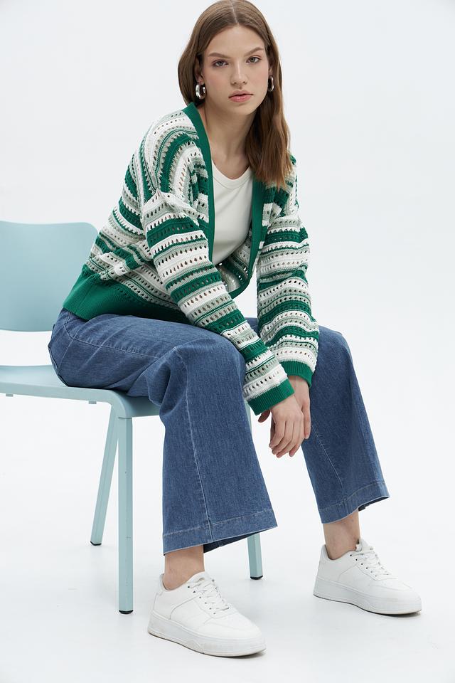 Женский жакет Tom Tailor зелёного цвета с ярким полосатым узором станет стильным дополнением к вашему гардеробу. Модель выполнена из 100% хлопка, что обеспечивает комфорт и удобство в носке. Состав: хлопок 100%