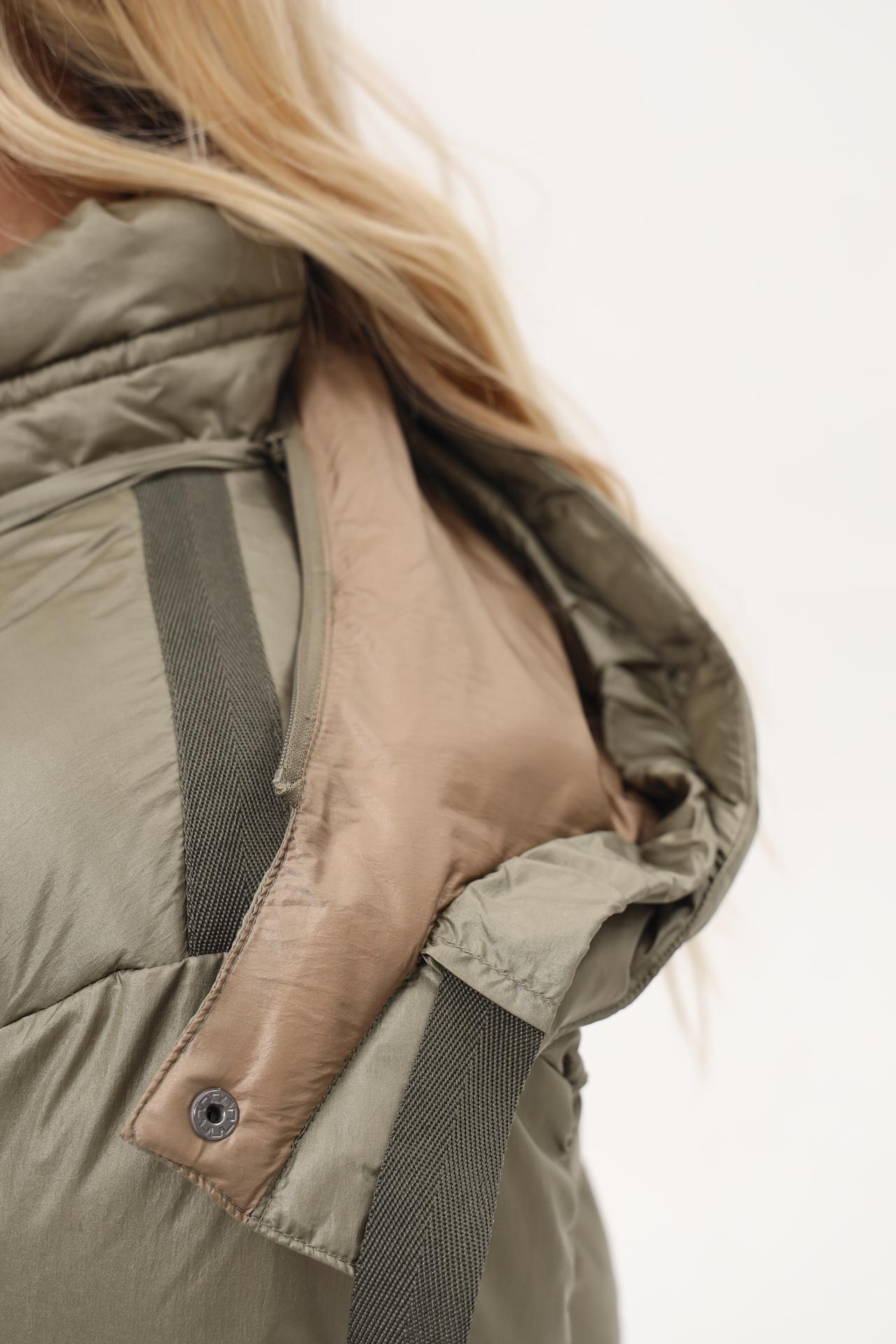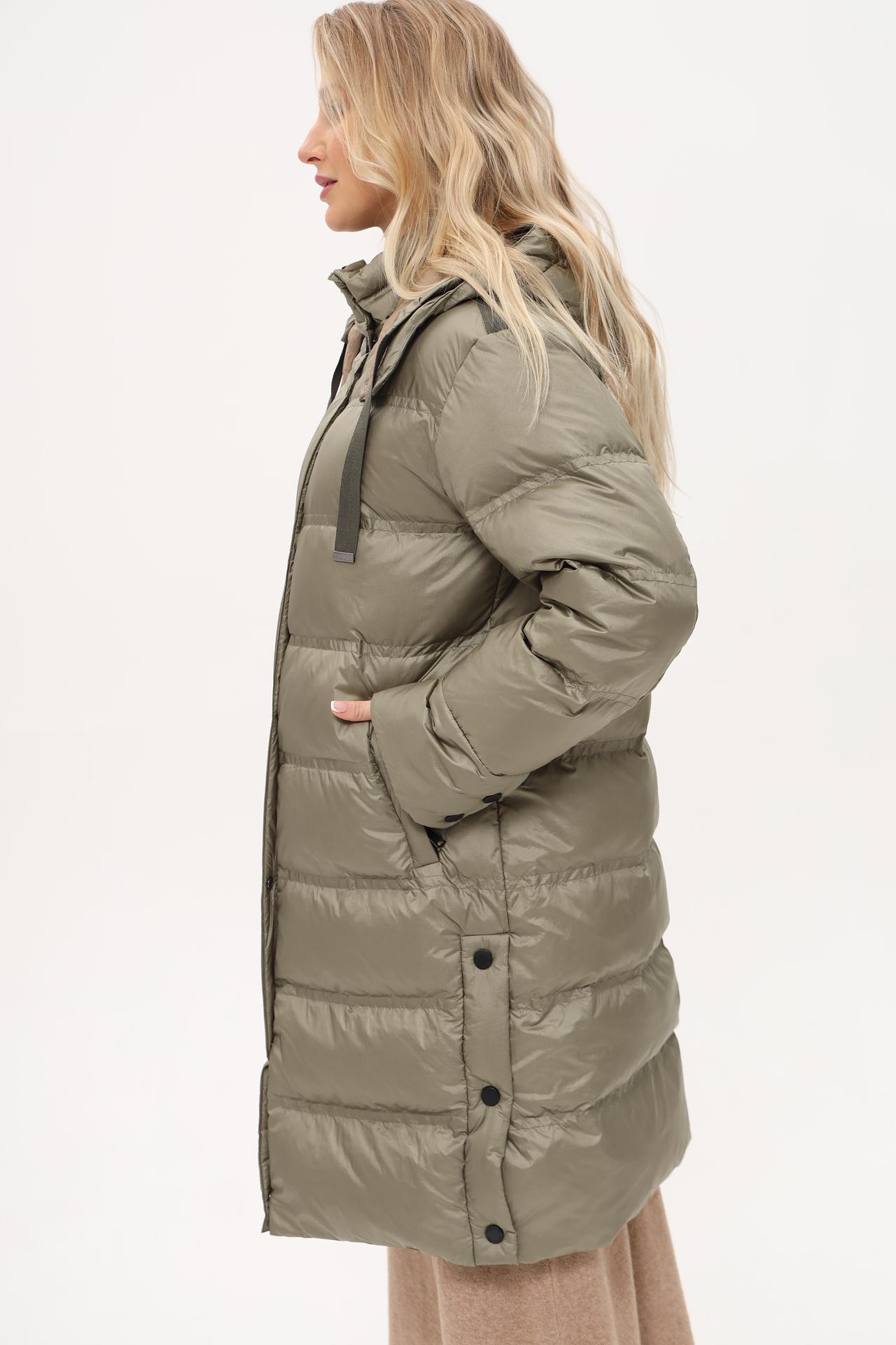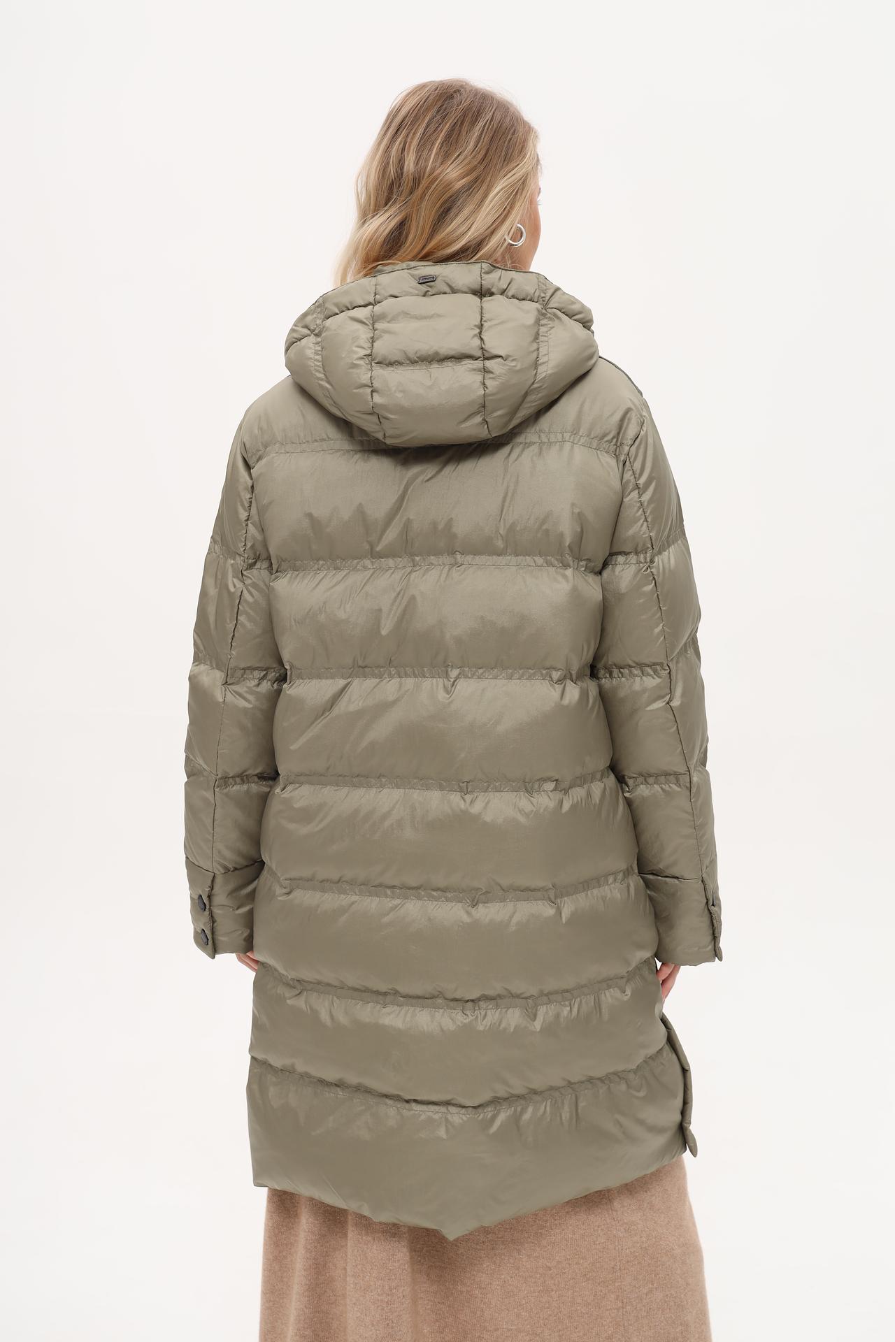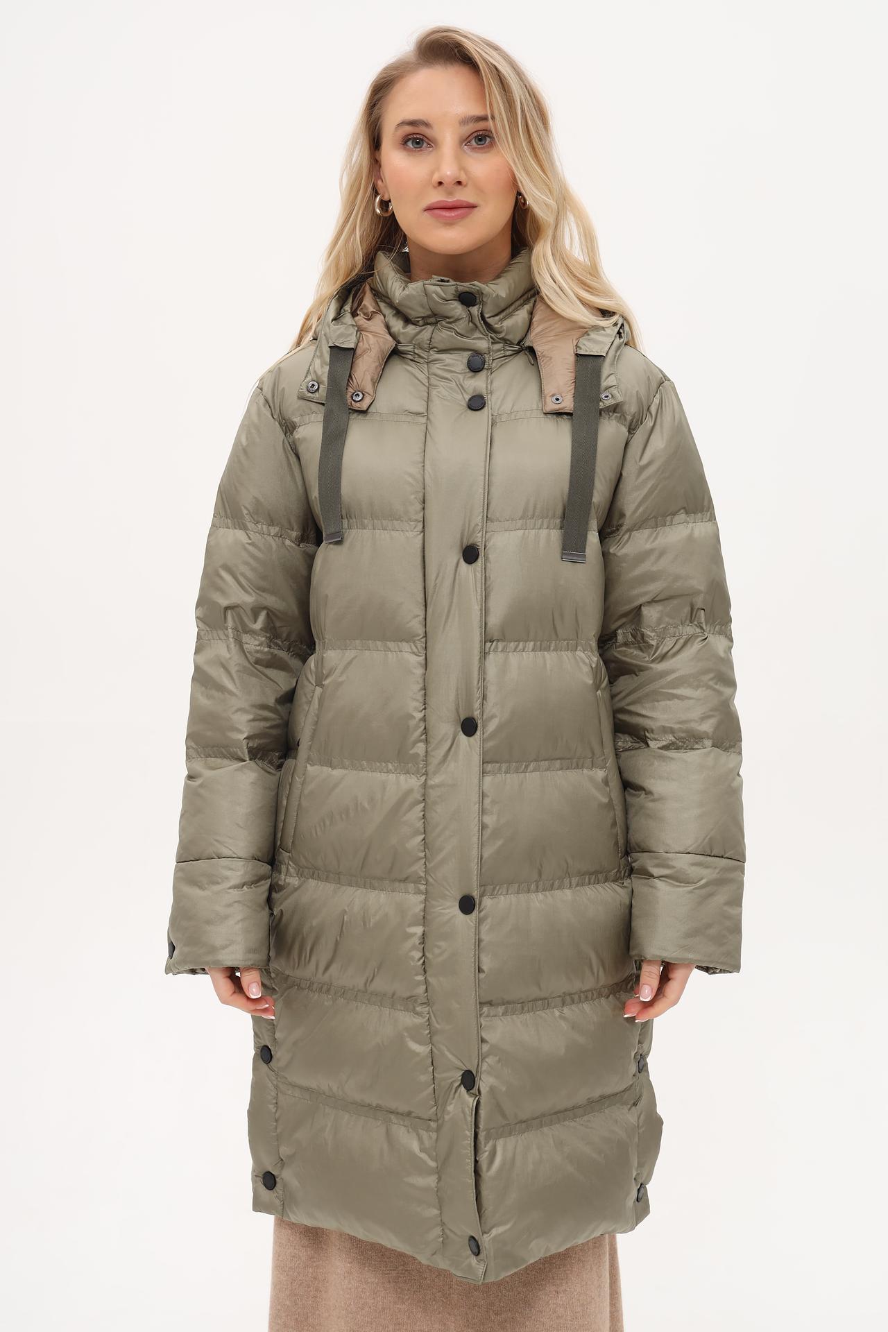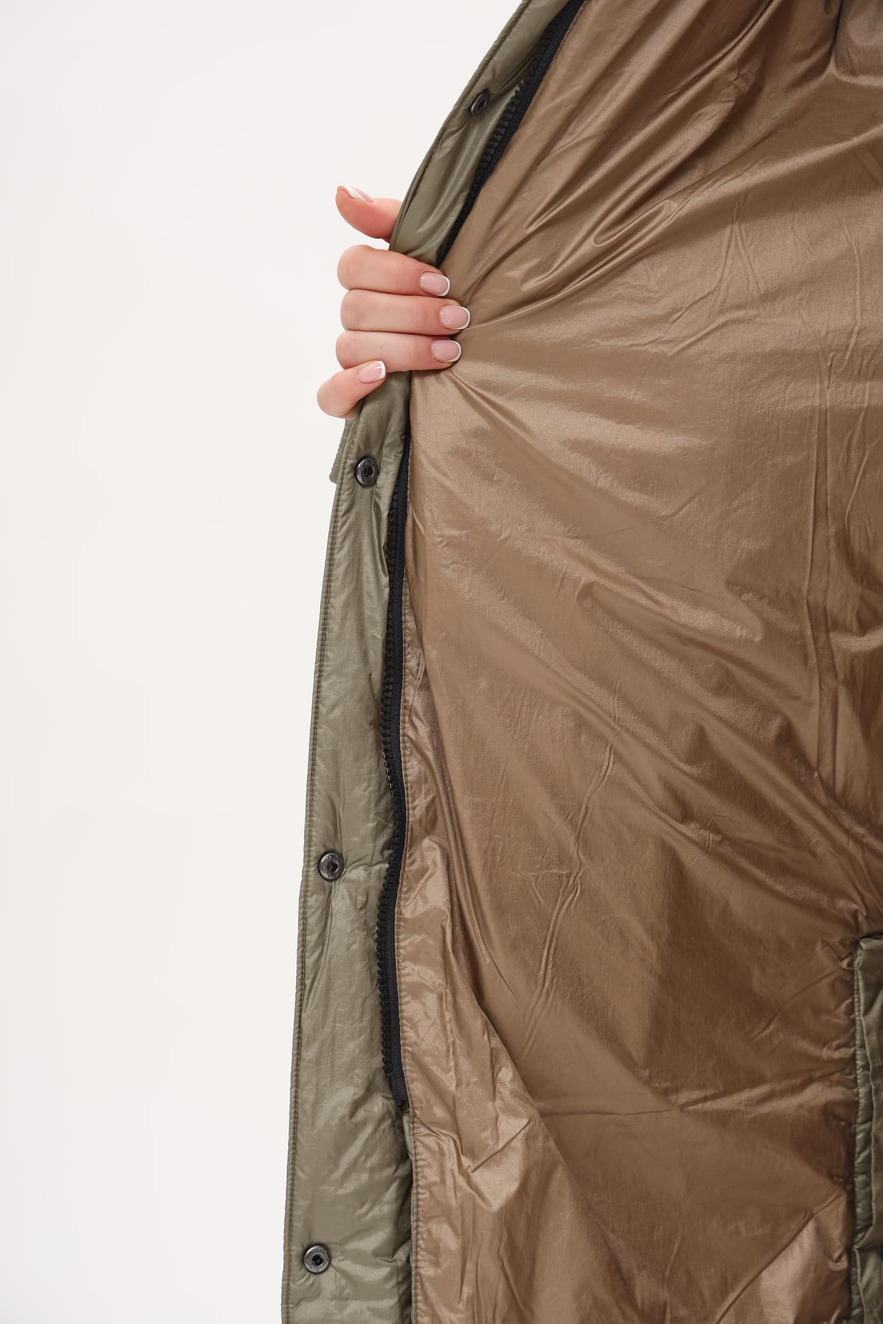 Пальто имеет современный дизайн и универсальный цвет хаки, который легко сочетается с любой одеждой, создавая элегантный и практичный образ. Длинный крой обеспечивает дополнительную защиту от холода и визуально стройнит фигуру.