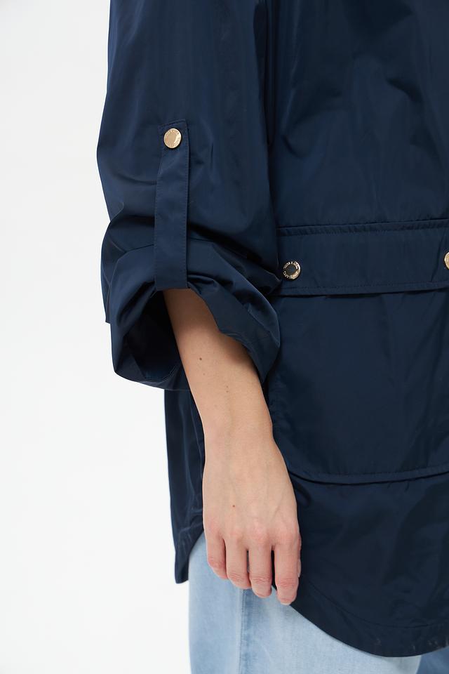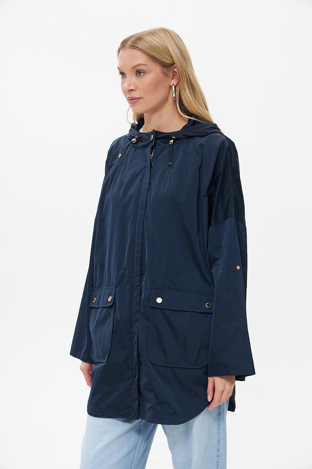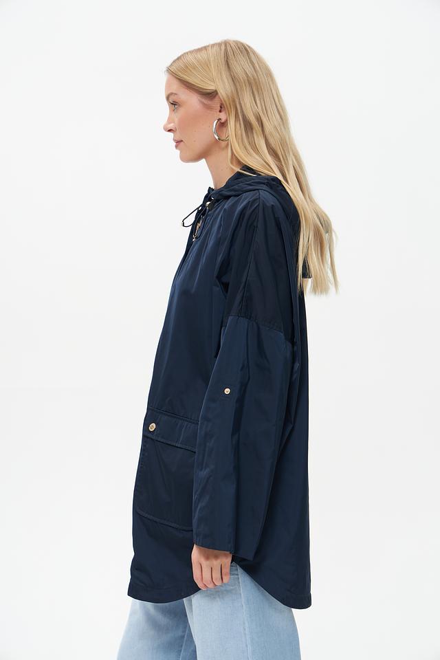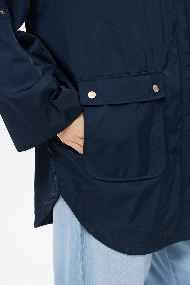 Куртка оснащена капюшоном со шнурком для регулировки посадки, а также двумя вместительными накладными карманами с застежкой на кнопку. Рукава куртки имеют манжеты с застежкой на пуговицу.