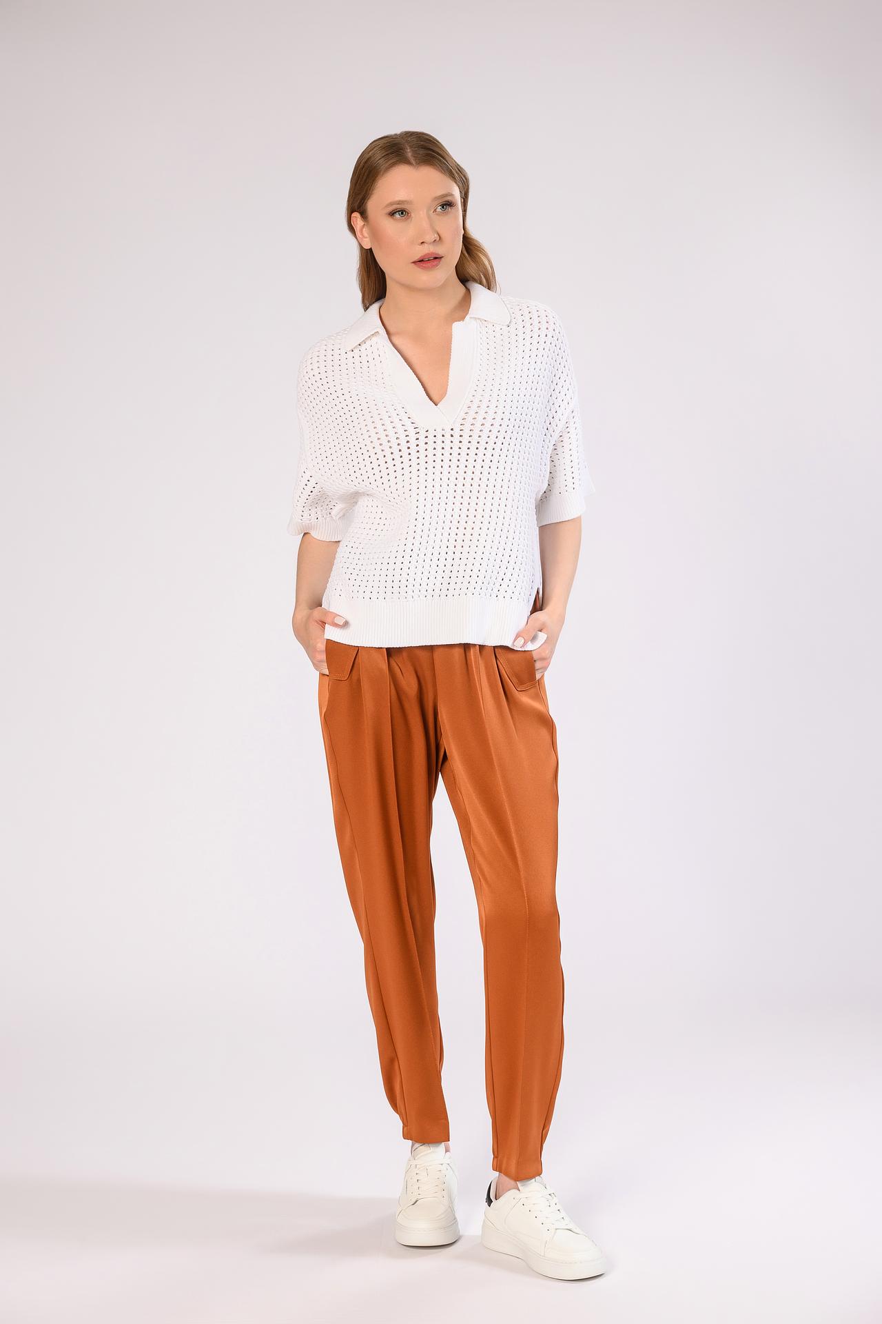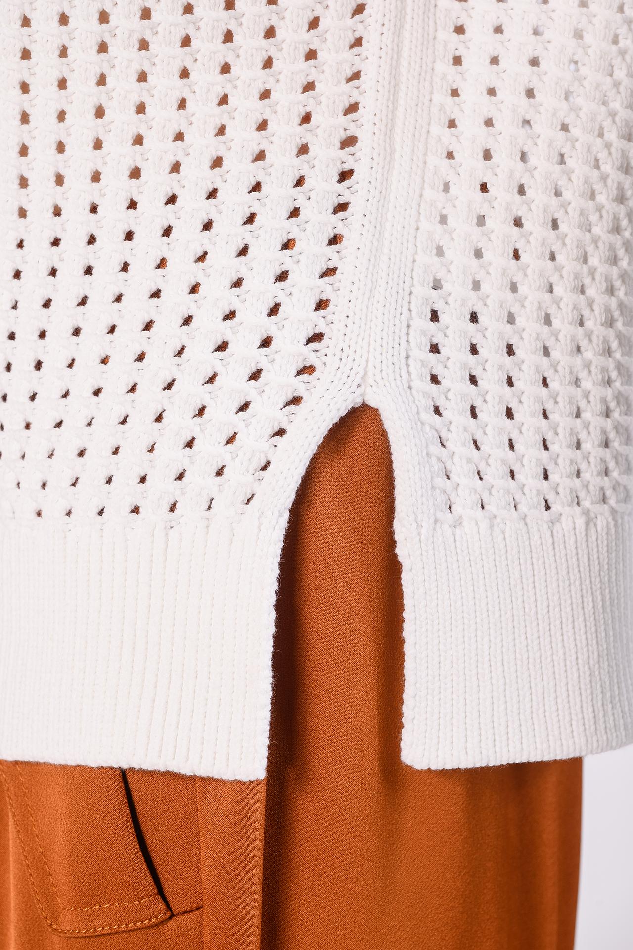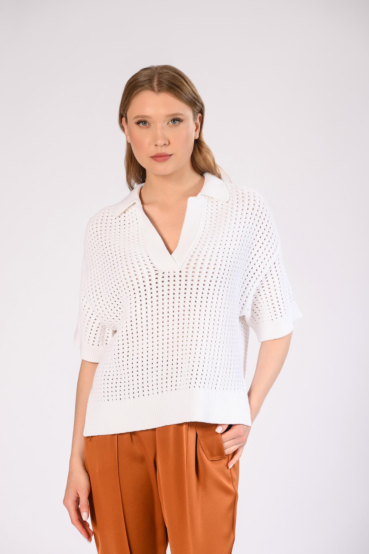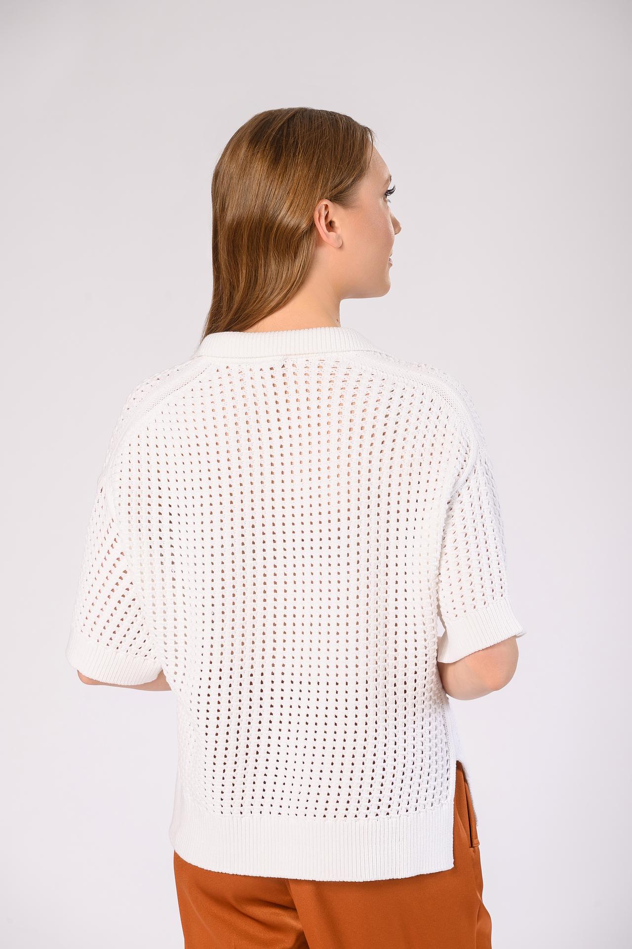 Модель с короткими рукавами и V-образным вырезом горловины отлично подходит для теплой погоды. Ажурный узор добавляет изюминку, делая джемпер уникальным.