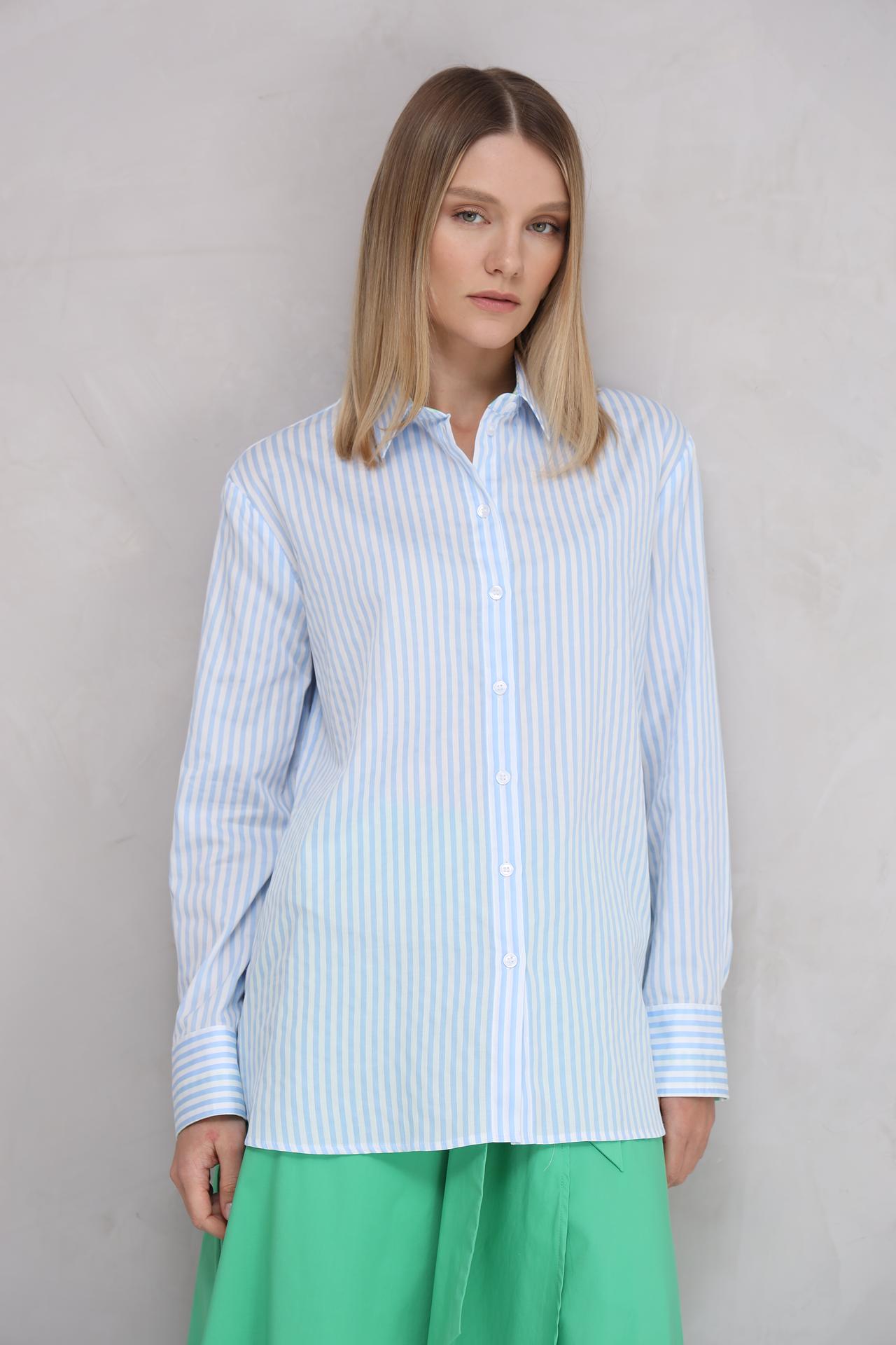 - Универсальный дизайн: Модель выполнена в классическом голубом цвете с тонкими белыми полосками, что делает ее универсальной базовой вещью. Отложной воротник и пуговицы по всей длине придают рубашке элегантный и завершенный вид.