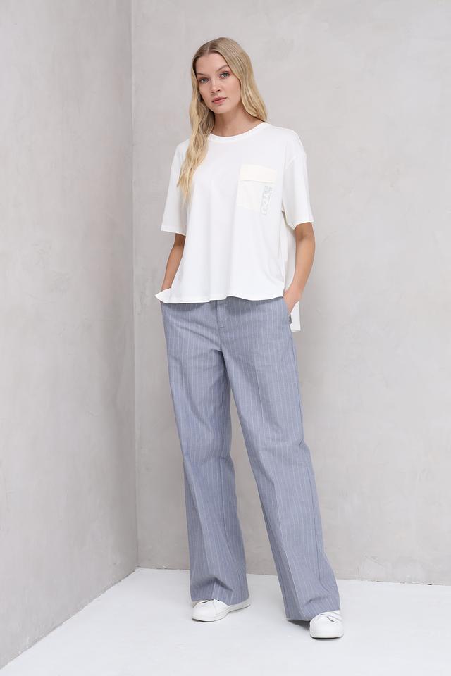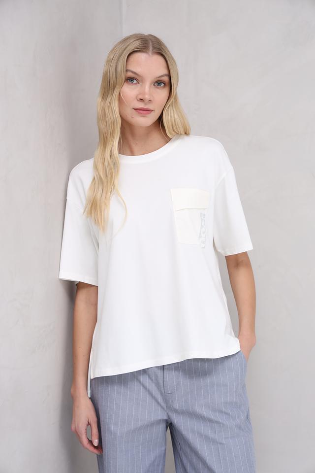 Модель имеет свободный крой, который обеспечивает комфорт в носке. На груди расположен накладной карман, который добавляет оригинальности образу. Футболка выполнена из высококачественного хлопка с добавлением эластана, что делает ее приятной к телу и обеспечивает хорошую посадку.