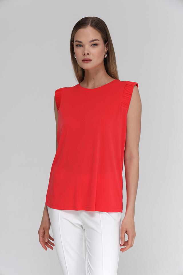 Красный топ от You Just White – это стильный и удобный выбор для создания яркого образа. Модель без рукавов с округлым вырезом и декоративными воланами на плечах добавит женственности вашему гардеробу. Состав: полиэстер 95%, эластан 5%