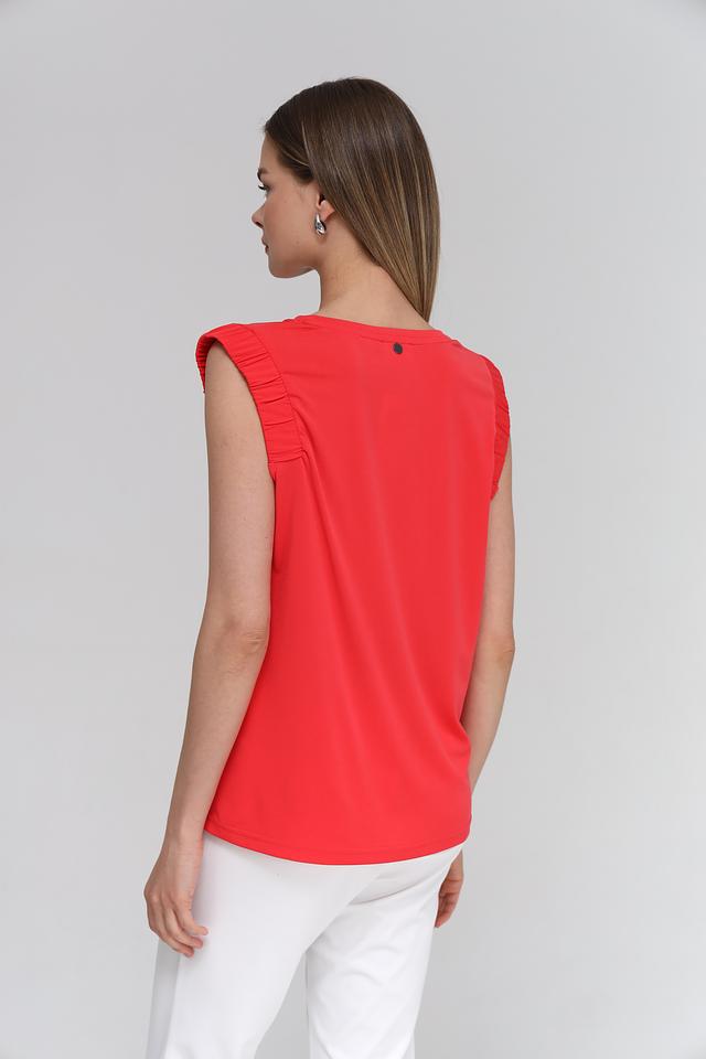 Топ имеет классический крой без рукавов и округлый вырез горловины. Особый акцент сделан на декоративные воланы на плечах, которые придают изделию женственность и оригинальность. Благодаря лаконичному дизайну, этот топ легко сочетается с различными предметами одежды – от джинсов и шорт до юбок и брюк.