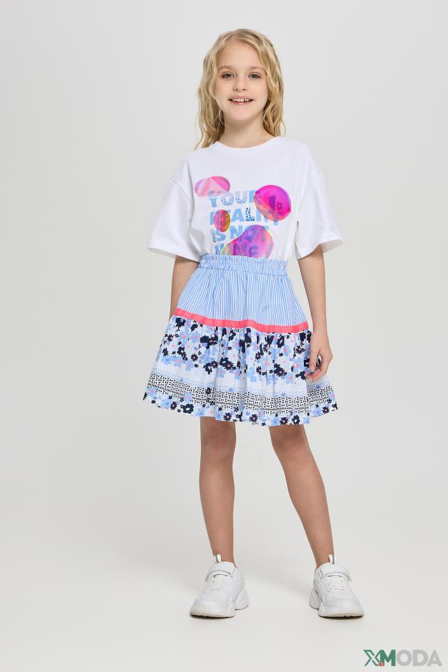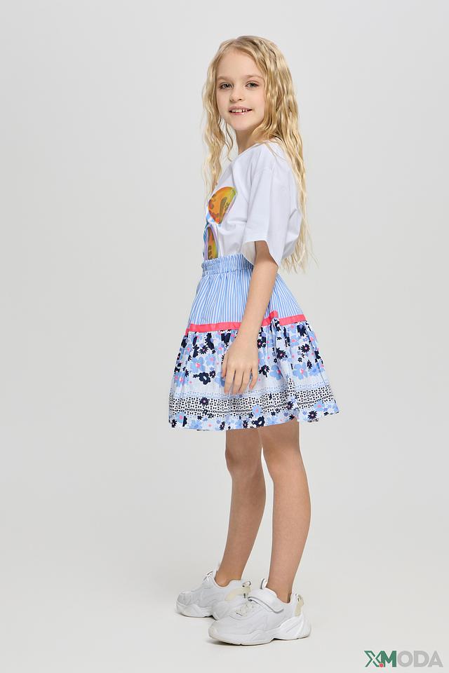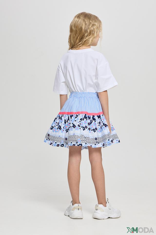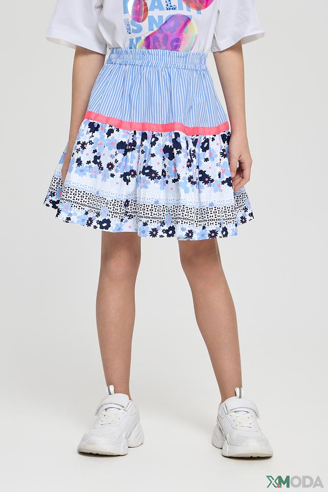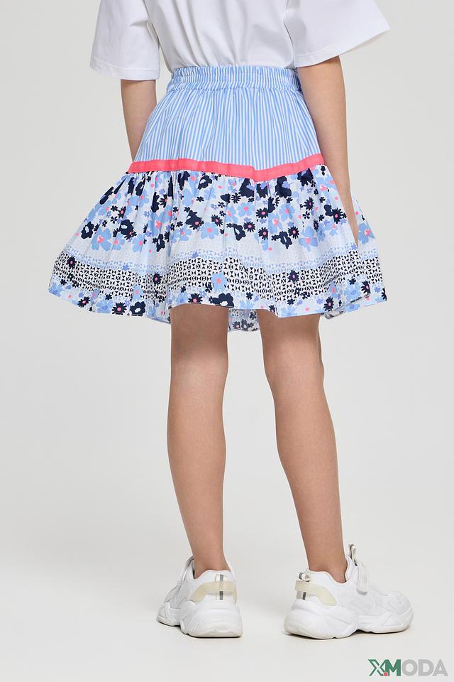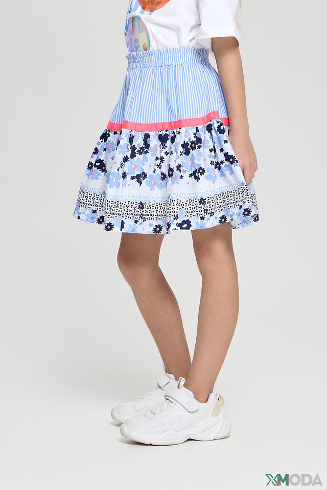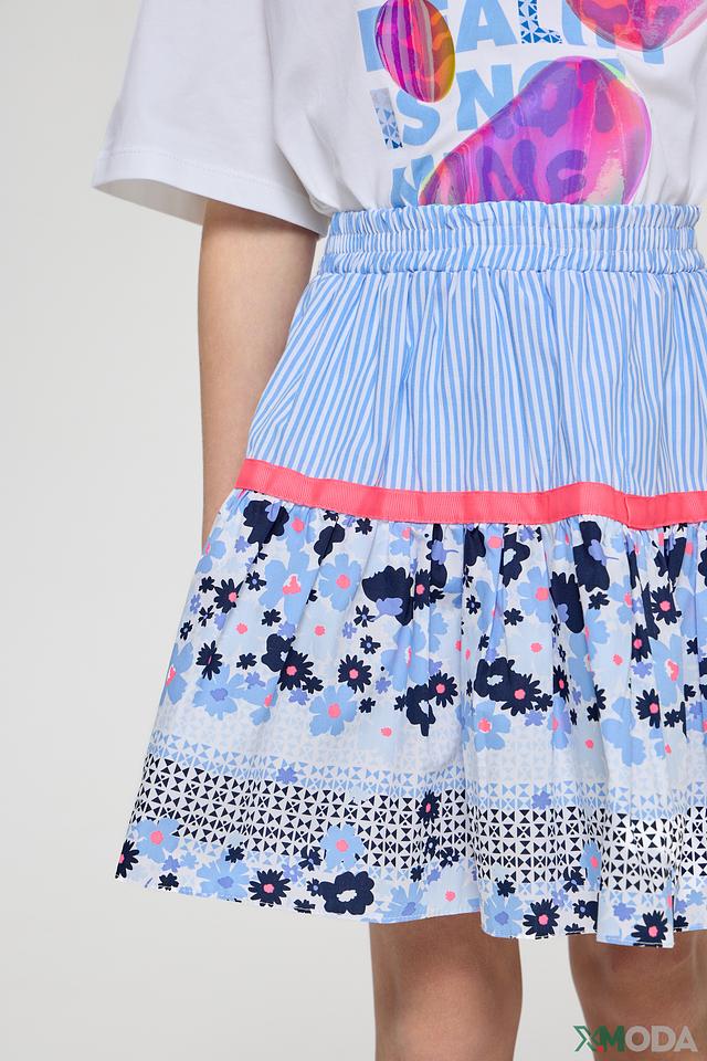 Юбка имеет яркий и красочный дизайн с цветочным принтом, сочетающим в себе голубые, розовые и белые оттенки. Верхняя часть юбки выполнена из полосатой ткани голубого и белого цвета, что добавляет ей игривости и оригинальности.