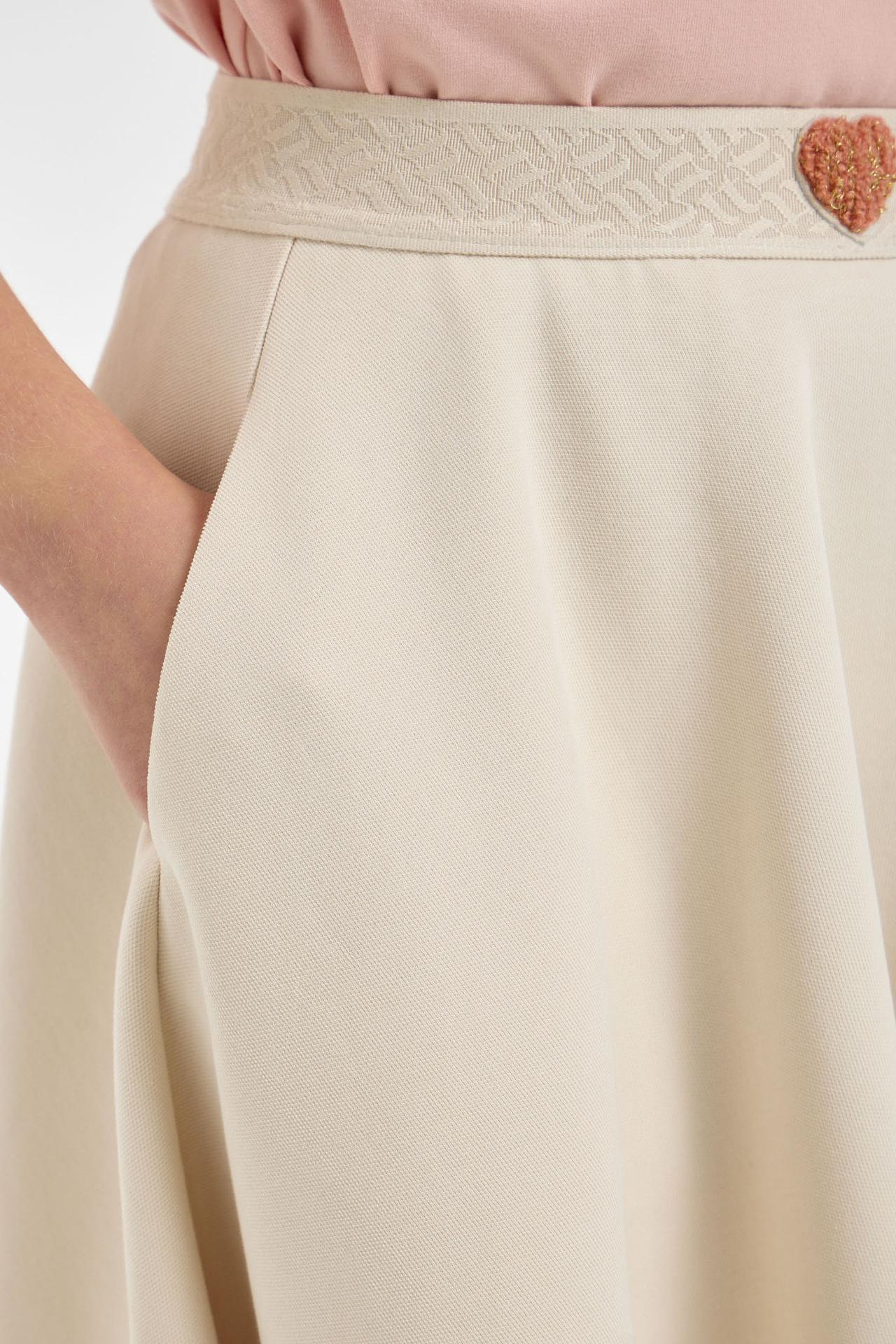 - Дизайн: Классический А-силуэт с миди-длиной подчеркивает изящность детской фигуры. Эластичный пояс с декоративным узором и милым сердцем-аппликацией придает юбке уникальность.