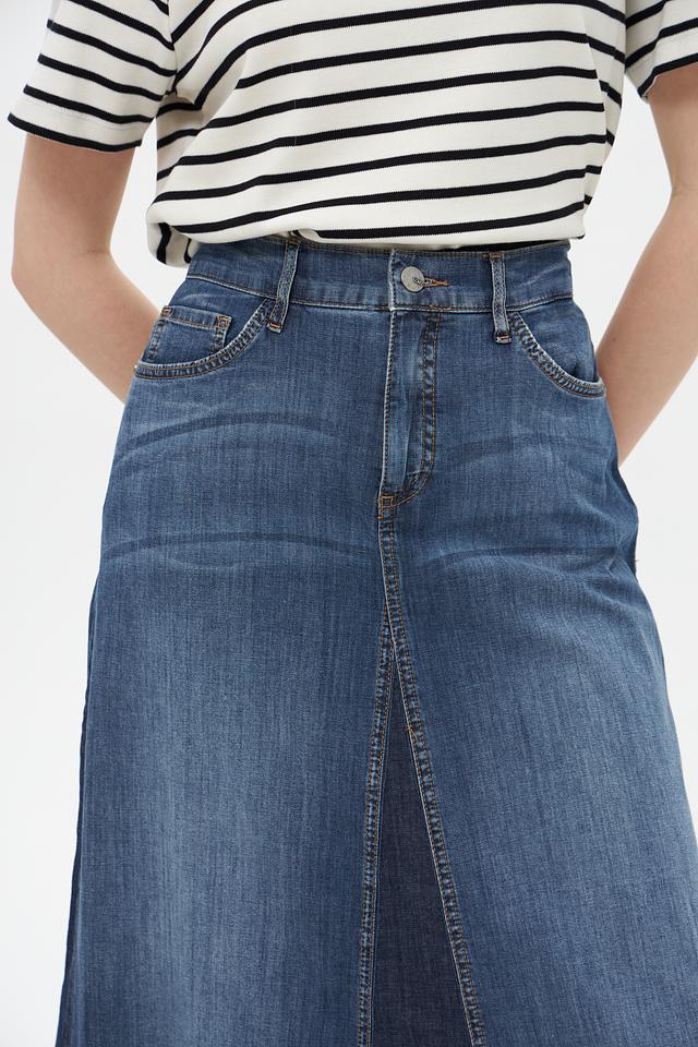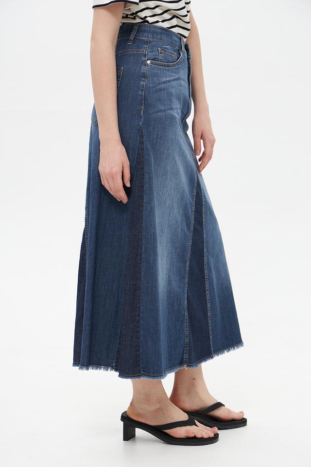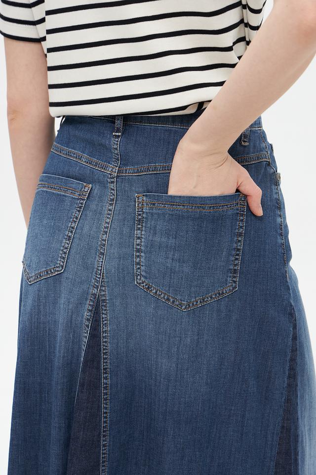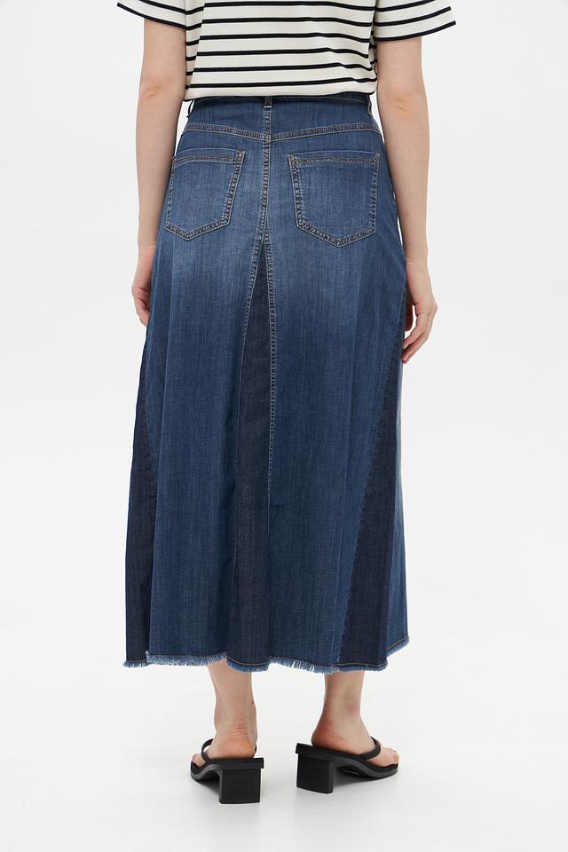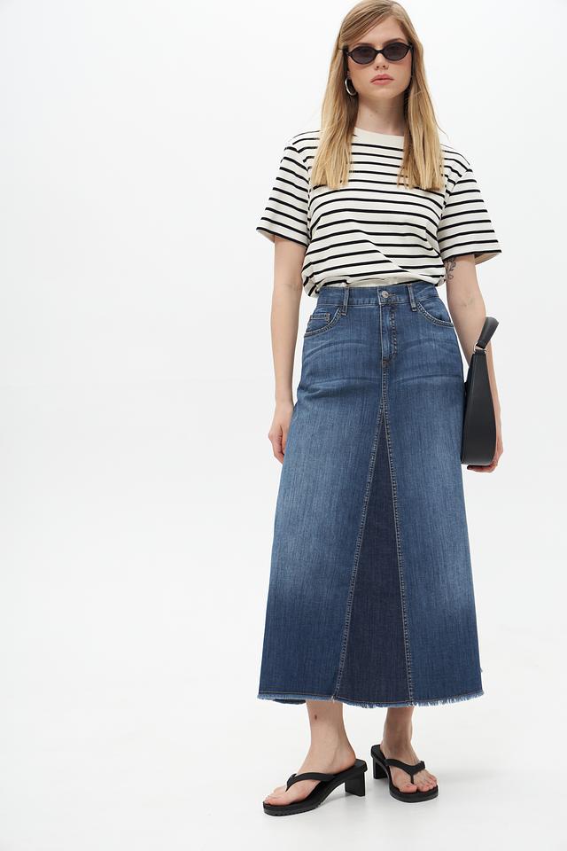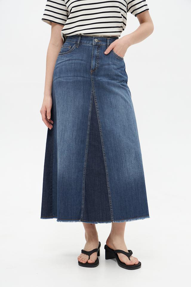 Юбка имеет высокую посадку, которая подчеркивает талию и создает элегантный силуэт. Расклешенный к низу крой придает образу легкость и женственность. Классический джинсовый цвет делает эту юбку универсальной и подходящей для различных стилей.