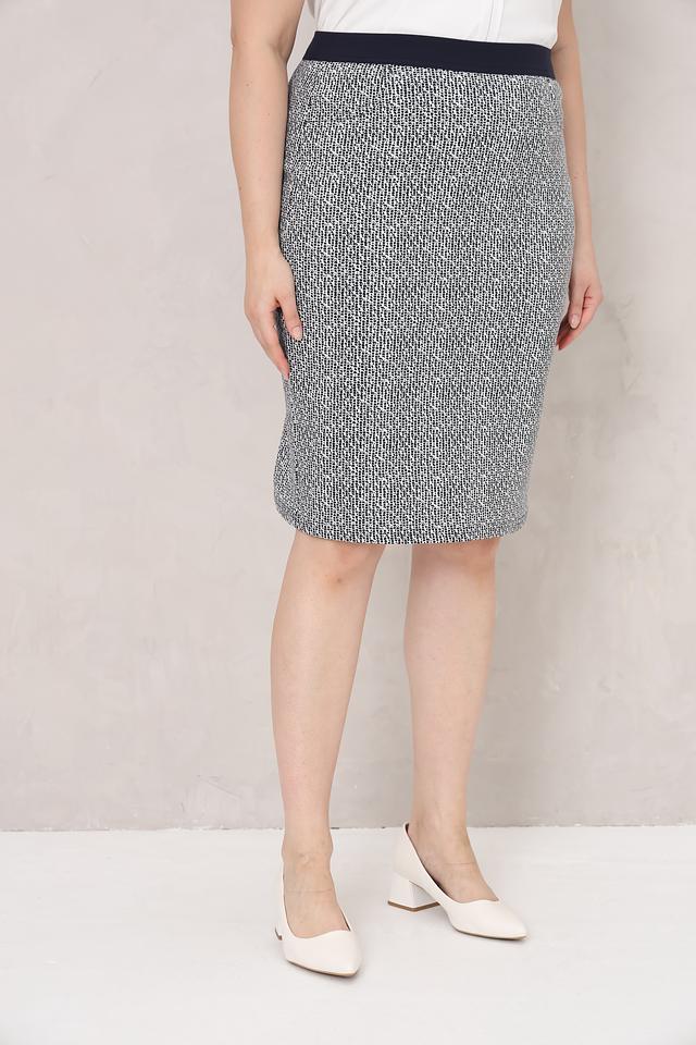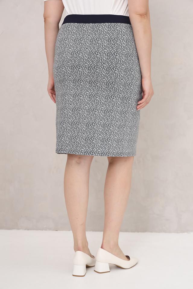 Юбка имеет классический крой – карандаш, который подчеркивает фигуру. Особенностью модели является мелкий клетчатый принт в сочетании серого и тёмно-синего цветов. Эластичный пояс обеспечивает удобную посадку по фигуре.
