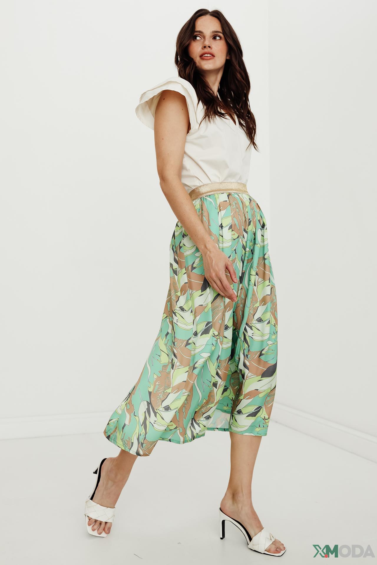 Расклешенный крой юбки отлично подчеркивает фигуру, а яркий и запоминающийся принт с листьями делает ее по-настоящему уникальной. Юбка отлично сочетается с различными топами, блузками и обувью, позволяя создавать разнообразные стильные образы.